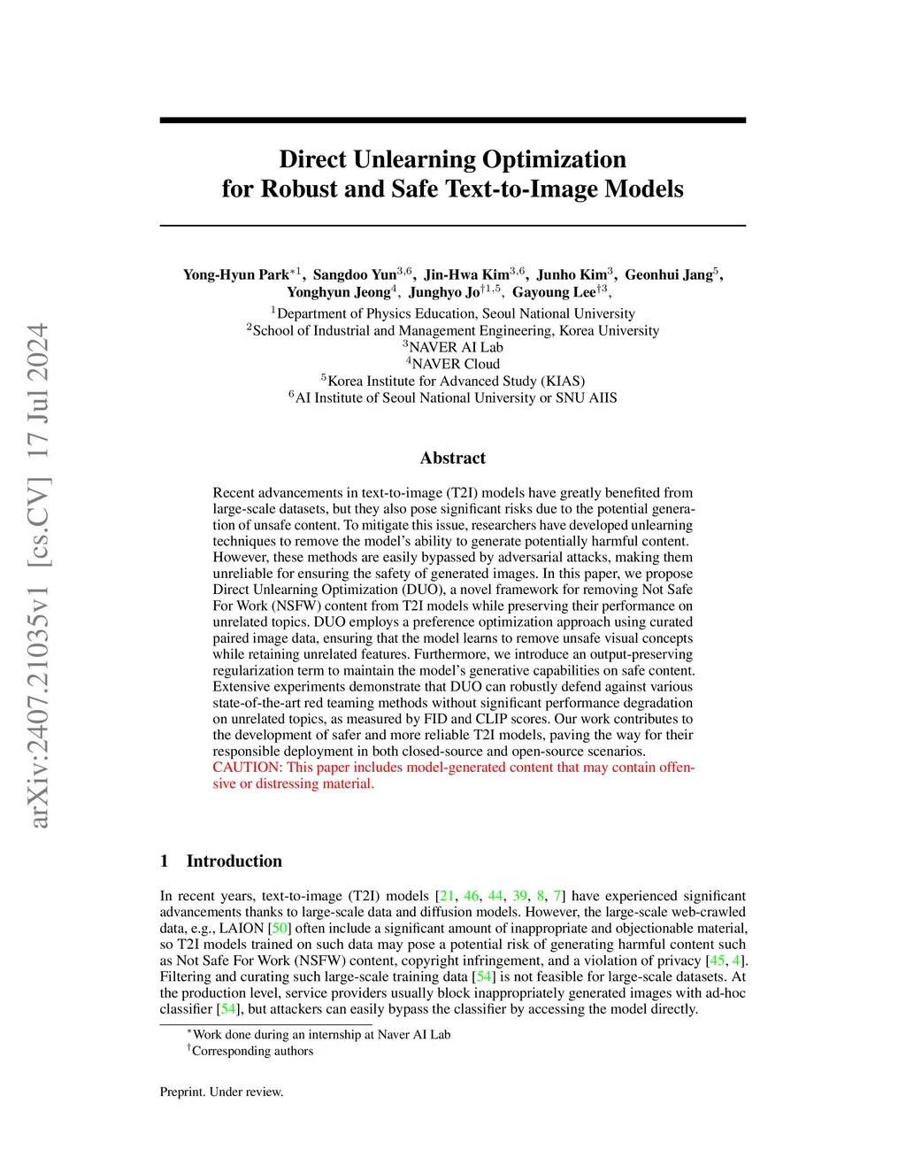 Recent advancements in text-to-image (T2I) models have unlocked a wide range of applications but also present significant risks, particularly in their potential to generate unsafe content. To mitigate this issue, researchers have developed unlearning techniques to remove the model's ability to generate potentially harmful content. However, these methods are easily bypassed by adversarial attacks, making them unreliable for ensuring the safety of generated images. In this paper, we propose Direct Unlearning Optimization (DUO), a novel framework for removing Not Safe For Work (NSFW) content from T2I models while preserving their performance on unrelated topics. DUO employs a preference optimization approach using curated paired image data, ensuring that the model learns to remove unsafe visual concepts while retaining unrelated features. Furthermore, we introduce an output-preserving regularization term to maintain the model's generative capabilities on safe content. Extensive experiments demonstrate that DUO can robustly defend against various state-of-the-art red teaming methods without significant performance degradation on unrelated topics, as measured by FID and CLIP scores. Our work contributes to the development of safer and more reliable T2I models, paving the way for their responsible deployment in both closed-source and open-source scenarios.