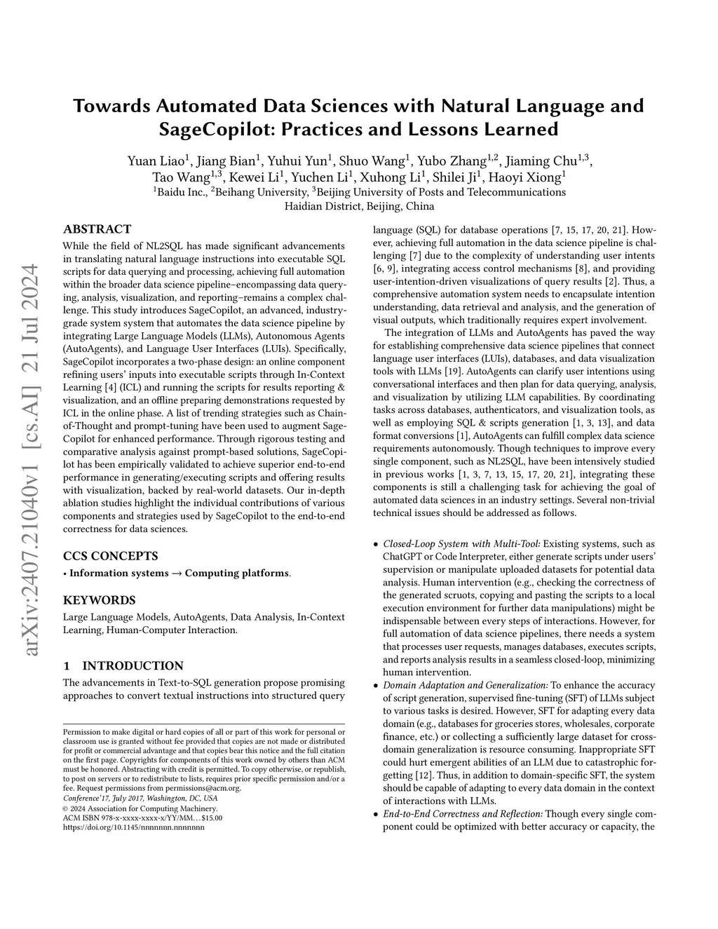 Towards Automated Data Sciences with Natural Language and SageCopilot: