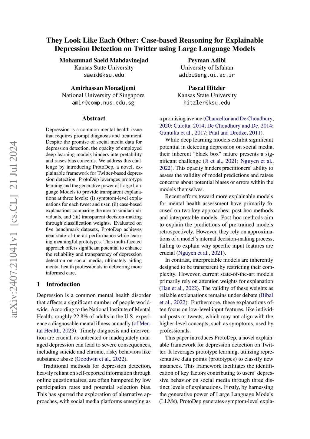 Depression is a common mental health issue that requires prompt diagnosis and treatment. Despite the promise of social media data for depression detection, the opacity of employed deep learning models hinders interpretability and raises bias concerns. We address this challenge by introducing ProtoDep, a novel, explainable framework for Twitter-based depression detection. ProtoDep leverages prototype learning and the generative power of Large Language Models to provide transparent explanations at three levels: (i) symptom-level explanations for each tweet and user, (ii) case-based explanations comparing the user to similar individuals, and (iii) transparent decision-making through classification weights. Evaluated on five benchmark datasets, ProtoDep achieves near state-of-the-art performance while learning meaningful prototypes. This multi-faceted approach offers significant potential to enhance the reliability and transparency of depression detection on social media, ultimately aiding mental health professionals in delivering more informed care.