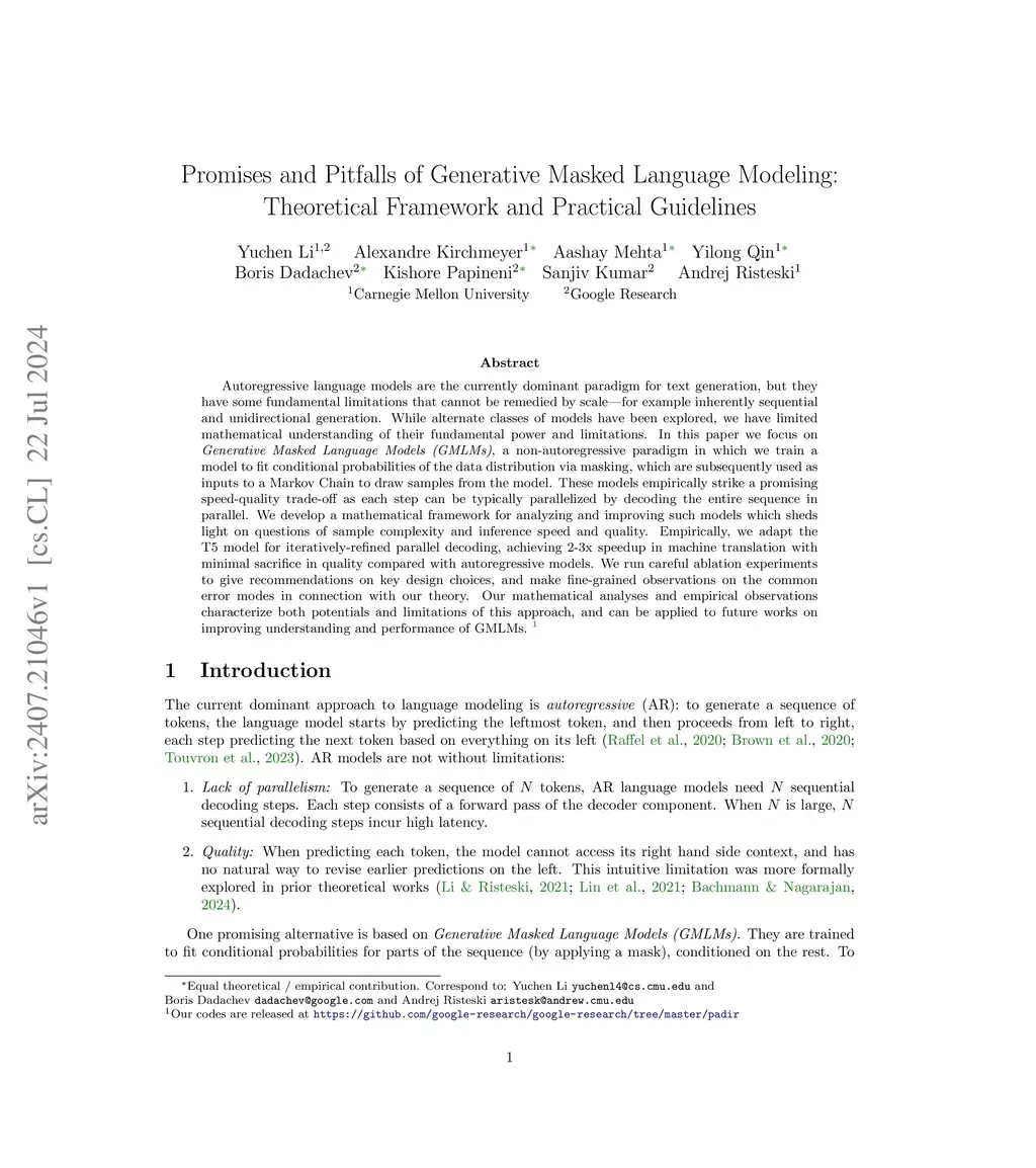 Autoregressive language models are the currently dominant paradigm for text generation, but they have some fundamental limitations that cannot be remedied by scale-for example inherently sequential and unidirectional generation. While alternate classes of models have been explored, we have limited mathematical understanding of their fundamental power and limitations. In this paper we focus on Generative Masked Language Models (GMLMs), a non-autoregressive paradigm in which we train a model to fit conditional probabilities of the data distribution via masking, which are subsequently used as inputs to a Markov Chain to draw samples from the model, These models empirically strike a promising speed-quality trade-off as each step can be typically parallelized by decoding the entire sequence in parallel. We develop a mathematical framework for analyzing and improving such models which sheds light on questions of sample complexity and inference speed and quality. Empirically, we adapt the T5 model for iteratively-refined parallel decoding, achieving 2-3x speedup in machine translation with minimal sacrifice in quality compared with autoregressive models. We run careful ablation experiments to give recommendations on key design choices, and make fine-grained observations on the common error modes in connection with our theory. Our mathematical analyses and empirical observations characterize both potentials and limitations of this approach, and can be applied to future works on improving understanding and performance of GMLMs. Our codes are released at https://github.com/google-research/google-research/tree/master/padir