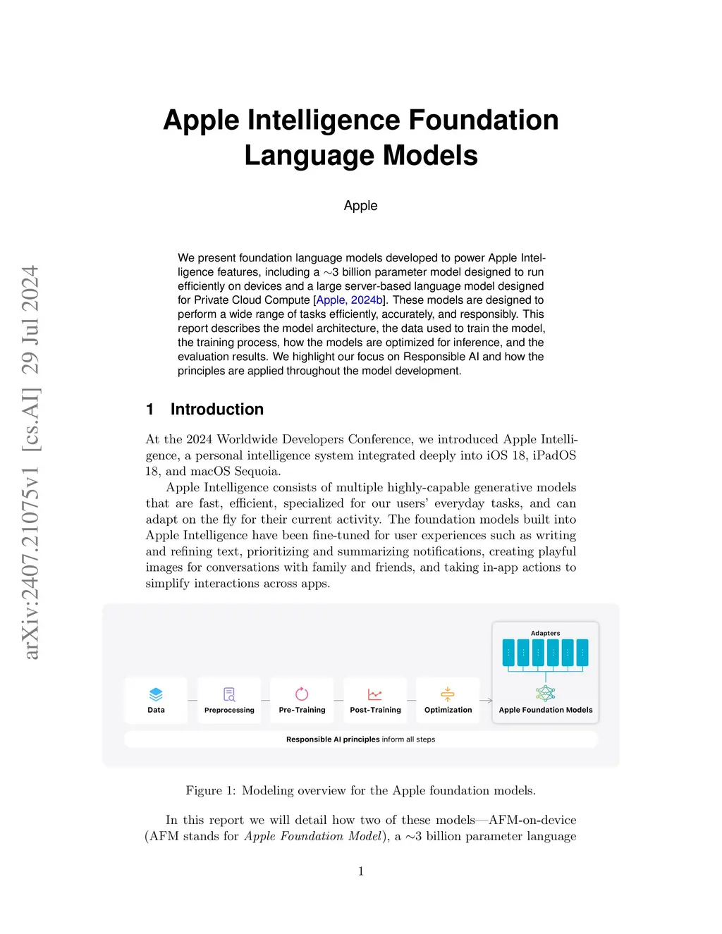 We present foundation language models developed to power Apple Intelligence features, including a ~3 billion parameter model designed to run efficiently on devices and a large server-based language model designed for Private Cloud Compute. These models are designed to perform a wide range of tasks efficiently, accurately, and responsibly. This report describes the model architecture, the data used to train the model, the training process, how the models are optimized for inference, and the evaluation results. We highlight our focus on Responsible AI and how the principles are applied throughout the model development.