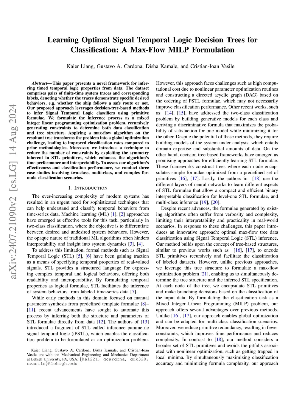 This paper presents a novel framework for inferring timed temporal logic properties from data. The dataset comprises pairs of finite-time system traces and corresponding labels, denoting whether the traces demonstrate specific desired behaviors, e.g. whether the ship follows a safe route or not. Our proposed approach leverages decision-tree-based methods to infer Signal Temporal Logic classifiers using primitive formulae. We formulate the inference process as a mixed integer linear programming optimization problem, recursively generating constraints to determine both data classification and tree structure. Applying a max-flow algorithm on the resultant tree transforms the problem into a global optimization challenge, leading to improved classification rates compared to prior methodologies. Moreover, we introduce a technique to reduce the number of constraints by exploiting the symmetry inherent in STL primitives, which enhances the algorithm's time performance and interpretability. To assess our algorithm's effectiveness and classification performance, we conduct three case studies involving two-class, multi-class, and complex formula classification scenarios.