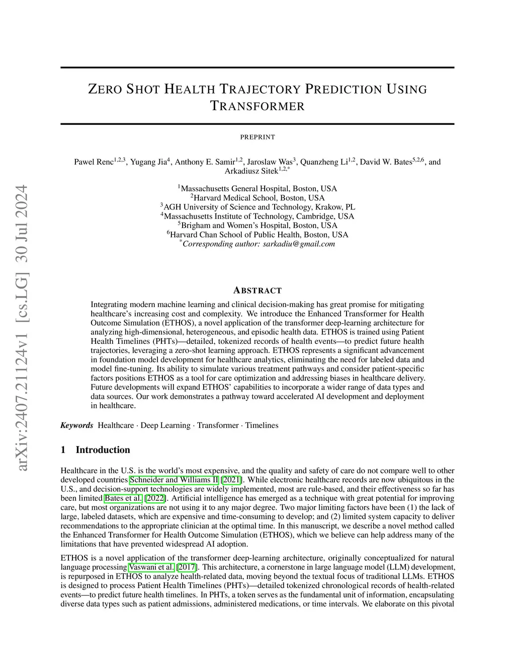 Integrating modern machine learning and clinical decision-making has great promise for mitigating healthcare's increasing cost and complexity. We introduce the Enhanced Transformer for Health Outcome Simulation (ETHOS), a novel application of the transformer deep-learning architecture for analyzing high-dimensional, heterogeneous, and episodic health data. ETHOS is trained using Patient Health Timelines (PHTs)-detailed, tokenized records of health events-to predict future health trajectories, leveraging a zero-shot learning approach. ETHOS represents a significant advancement in foundation model development for healthcare analytics, eliminating the need for labeled data and model fine-tuning. Its ability to simulate various treatment pathways and consider patient-specific factors positions ETHOS as a tool for care optimization and addressing biases in healthcare delivery. Future developments will expand ETHOS' capabilities to incorporate a wider range of data types and data sources. Our work demonstrates a pathway toward accelerated AI development and deployment in healthcare.