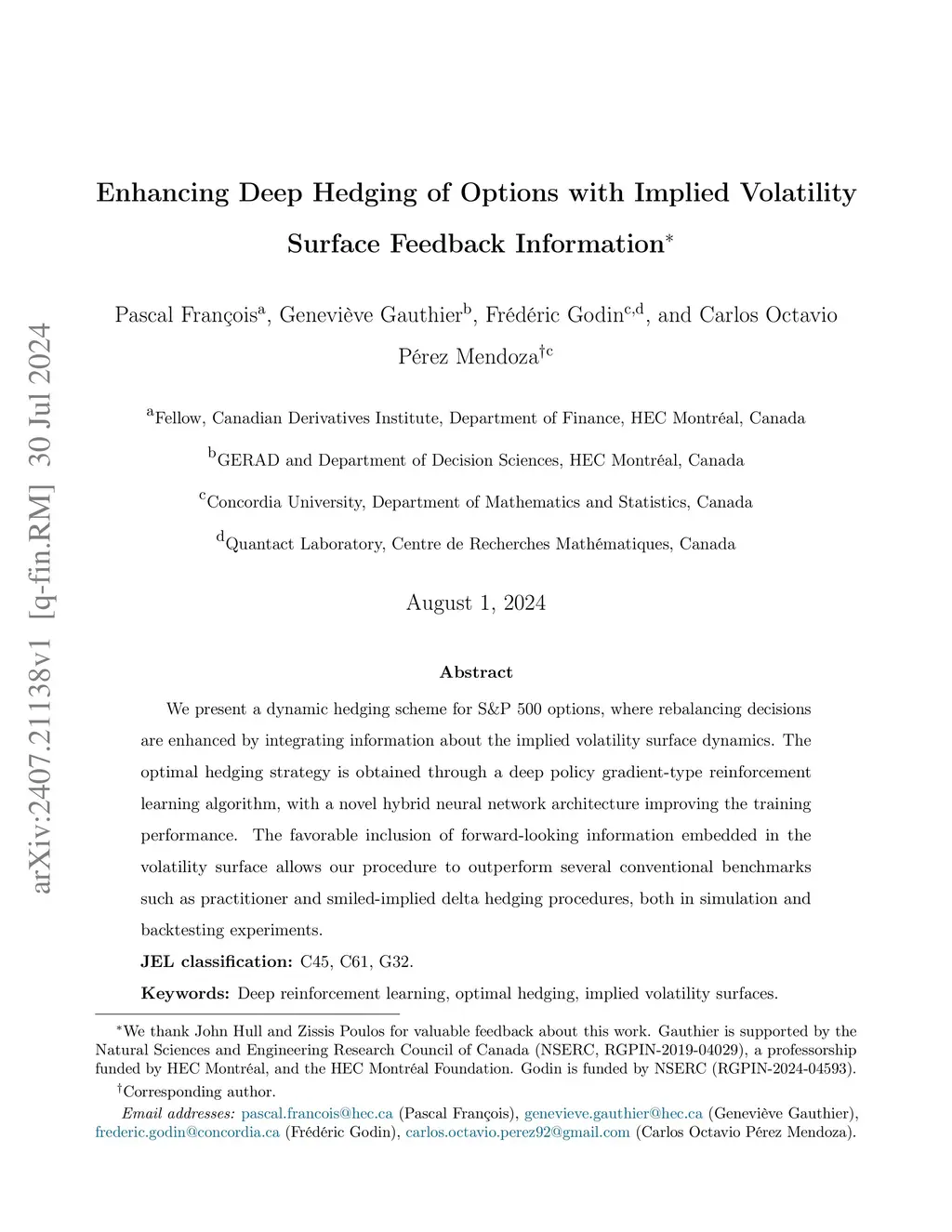 We present a dynamic hedging scheme for S&P 500 options, where rebalancing decisions are enhanced by integrating information about the implied volatility surface dynamics. The optimal hedging strategy is obtained through a deep policy gradient-type reinforcement learning algorithm. The favorable inclusion of forward-looking information embedded in the volatility surface allows our procedure to outperform several conventional benchmarks such as practitioner and smiled-implied delta hedging procedures, both in simulation and backtesting experiments. The outperformance is more pronounced in the presence of transaction costs.