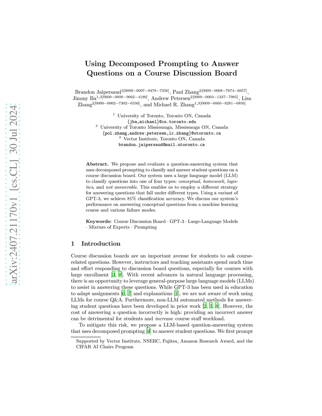 We propose and evaluate a question-answering system that uses decomposed prompting to classify and answer student questions on a course discussion board. Our system uses a large language model (LLM) to classify questions into one of four types: conceptual, homework, logistics, and not answerable. This enables us to employ a different strategy for answering questions that fall under different types. Using a variant of GPT-3, we achieve classification accuracy. We discuss our system's performance on answering conceptual questions from a machine learning course and various failure modes.
