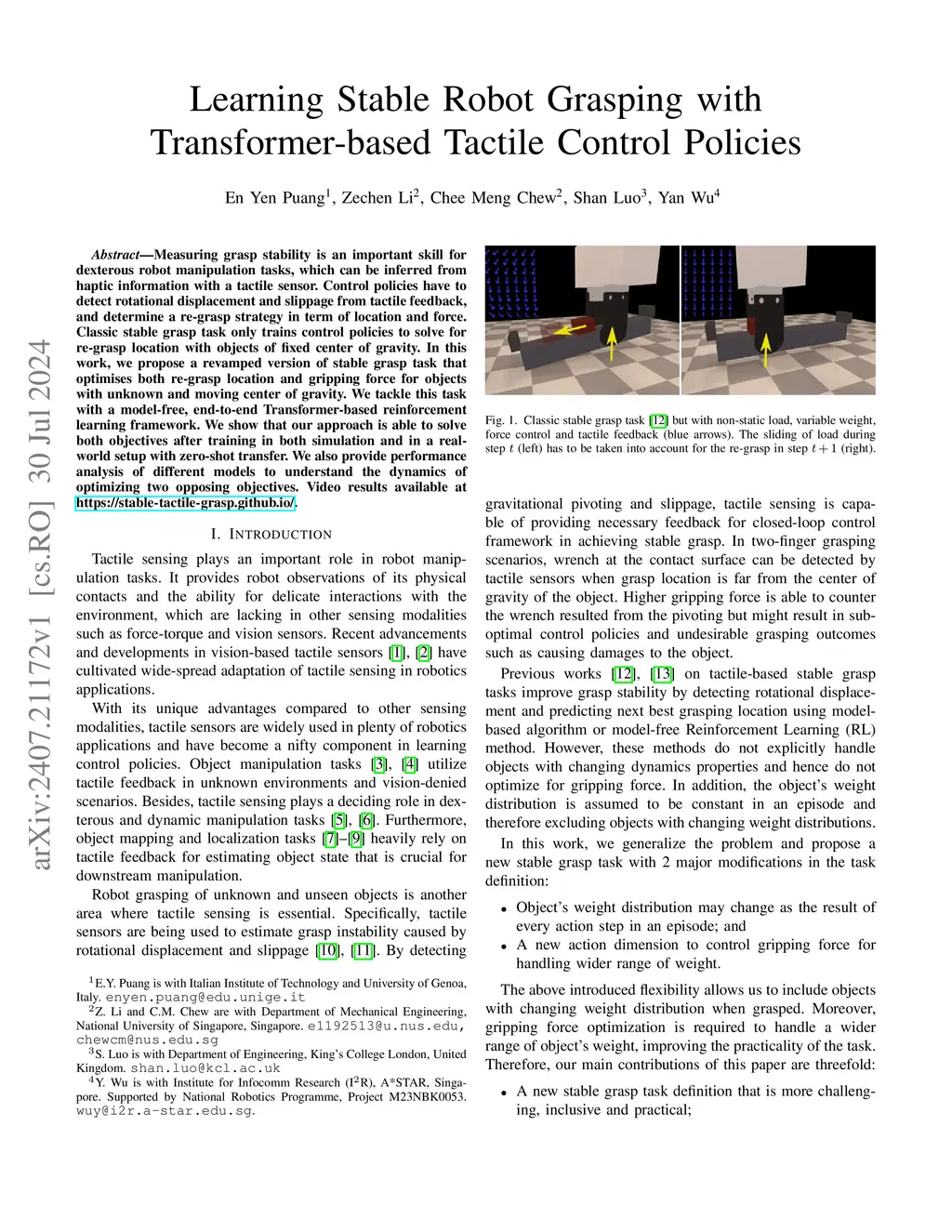 Measuring grasp stability is an important skill for dexterous robot manipulation tasks, which can be inferred from haptic information with a tactile sensor. Control policies have to detect rotational displacement and slippage from tactile feedback, and determine a re-grasp strategy in term of location and force. Classic stable grasp task only trains control policies to solve for re-grasp location with objects of fixed center of gravity. In this work, we propose a revamped version of stable grasp task that optimises both re-grasp location and gripping force for objects with unknown and moving center of gravity. We tackle this task with a model-free, end-to-end Transformer-based reinforcement learning framework. We show that our approach is able to solve both objectives after training in both simulation and in a real-world setup with zero-shot transfer. We also provide performance analysis of different models to understand the dynamics of optimizing two opposing objectives.