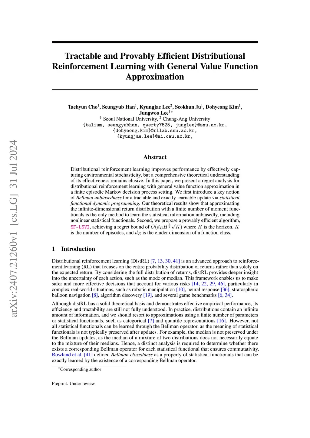 Distributional reinforcement learning improves performance by capturing environmental stochasticity, but a comprehensive theoretical understanding of its effectiveness remains elusive. In addition, the intractable element of the infinite dimensionality of distributions has been overlooked. In this paper, we present a regret analysis of distributional reinforcement learning with general value function approximation in a finite episodic Markov decision process setting. We first introduce a key notion of which is essential for exactly learnable and provably efficient distributional updates in an online manner. Among all types of statistical functionals for representing infinite-dimensional return distributions, our theoretical results demonstrate that only moment functionals can exactly capture the statistical information. Secondly, we propose a provably efficient algorithm, , that achieves a tight regret bound of where is the horizon, is the number of episodes, and is the eluder dimension of a function class.