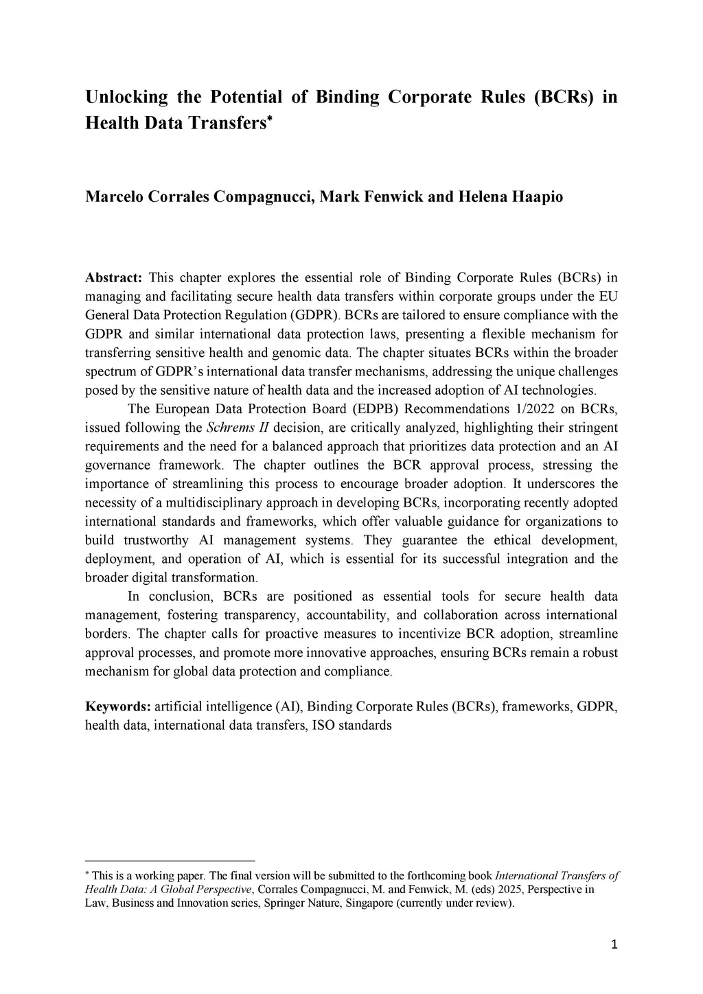 This chapter explores the essential role of Binding Corporate Rules (BCRs) in managing and facilitating secure health data transfers within corporate groups under the EU General Data Protection Regulation (GDPR). BCRs are tailored to ensure compliance with the GDPR and similar international data protection laws, presenting a flexible mechanism for transferring sensitive health and genomic data. The chapter situates BCRs within the broader spectrum of the GDPR international data transfer mechanisms, addressing the unique challenges posed by the sensitive nature of health data and the increased adoption of AI technologies. The European Data Protection Board (EDPB) Recommendations 1/2022 on BCRs, issued following the Schrems II decision, are critically analyzed, highlighting their stringent requirements and the need for a balanced approach that prioritizes data protection and an AI governance framework. The chapter outlines the BCR approval process, stressing the importance of streamlining this process to encourage broader adoption. It underscores the necessity of a multidisciplinary approach in developing BCRs, incorporating recently adopted international standards and frameworks, which offer valuable guidance for organizations to build trustworthy AI management systems. They guarantee the ethical development, deployment, and operation of AI, which is essential for its successful integration and the broader digital transformation. In conclusion, BCRs are positioned as essential tools for secure health data management, fostering transparency, accountability, and collaboration across international borders. The chapter calls for proactive measures to incentivize BCR adoption, streamline approval processes, and promote more innovative approaches, ensuring BCRs remain a robust mechanism for global data protection and compliance.