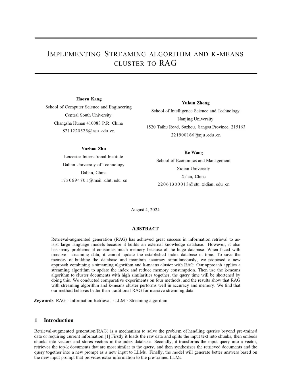 Retrieval-augmented generation (RAG) has achieved significant success in information retrieval to assist large language models LLMs because it builds an external knowledge database. However, it also has many problems, it consumes a lot of memory because of the enormous database, and it cannot update the established index database in time when confronted with massive streaming data. To reduce the memory required for building the database and maintain accuracy simultaneously, we proposed a new approach integrating a streaming algorithm with k-means clustering into RAG. Our approach applied a streaming algorithm to update the index dynamically and reduce memory consumption. Additionally, the k-means algorithm clusters highly similar documents, and the query time would be shortened. We conducted comparative experiments on four methods, and the results indicated that RAG with streaming algorithm and k-means clusters outperforms traditional RAG in accuracy and memory, particularly when dealing with large-scale streaming data.
