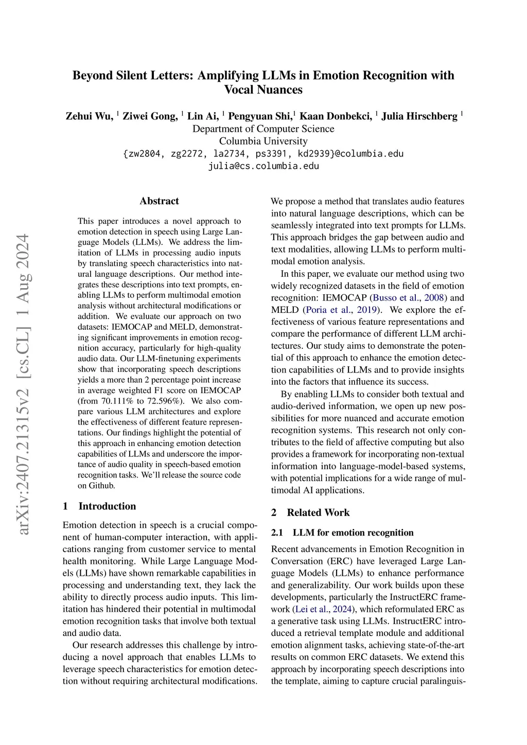 This paper introduces a novel approach to emotion detection in speech using Large Language Models (LLMs). We address the limitation of LLMs in processing audio inputs by translating speech characteristics into natural language descriptions. Our method integrates these descriptions into text prompts, enabling LLMs to perform multimodal emotion analysis without architectural modifications. We evaluate our approach on two datasets: IEMOCAP and MELD, demonstrating significant improvements in emotion recognition accuracy, particularly for high-quality audio data. Our experiments show that incorporating speech descriptions yields a 2 percentage point increase in weighted F1 score on IEMOCAP (from 70.111\% to 72.596\%). We also compare various LLM architectures and explore the effectiveness of different feature representations. Our findings highlight the potential of this approach in enhancing emotion detection capabilities of LLMs and underscore the importance of audio quality in speech-based emotion recognition tasks. We'll release the source code on Github.
