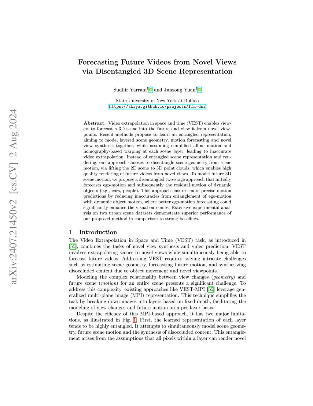 Video extrapolation in space and time (VEST) enables viewers to forecast a 3D scene into the future and view it from novel viewpoints. Recent methods propose to learn an entangled representation, aiming to model layered scene geometry, motion forecasting and novel view synthesis together, while assuming simplified affine motion and homography-based warping at each scene layer, leading to inaccurate video extrapolation. Instead of entangled scene representation and rendering, our approach chooses to disentangle scene geometry from scene motion, via lifting the 2D scene to 3D point clouds, which enables high quality rendering of future videos from novel views. To model future 3D scene motion, we propose a disentangled two-stage approach that initially forecasts ego-motion and subsequently the residual motion of dynamic objects (e.g., cars, people). This approach ensures more precise motion predictions by reducing inaccuracies from entanglement of ego-motion with dynamic object motion, where better ego-motion forecasting could significantly enhance the visual outcomes. Extensive experimental analysis on two urban scene datasets demonstrate superior performance of our proposed method in comparison to strong baselines.