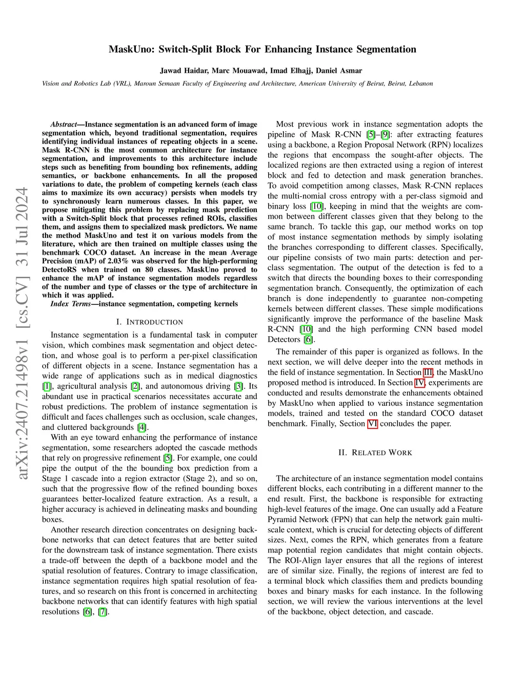 Instance segmentation is an advanced form of image segmentation which, beyond traditional segmentation, requires identifying individual instances of repeating objects in a scene. Mask R-CNN is the most common architecture for instance segmentation, and improvements to this architecture include steps such as benefiting from bounding box refinements, adding semantics, or backbone enhancements. In all the proposed variations to date, the problem of competing kernels (each class aims to maximize its own accuracy) persists when models try to synchronously learn numerous classes. In this paper, we propose mitigating this problem by replacing mask prediction with a Switch-Split block that processes refined ROIs, classifies them, and assigns them to specialized mask predictors. We name the method MaskUno and test it on various models from the literature, which are then trained on multiple classes using the benchmark COCO dataset. An increase in the mean Average Precision (mAP) of 2.03% was observed for the high-performing DetectoRS when trained on 80 classes. MaskUno proved to enhance the mAP of instance segmentation models regardless of the number and typ
