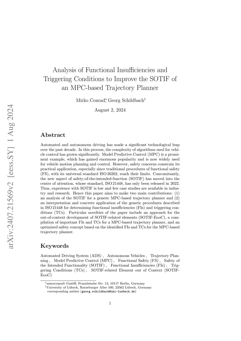 Automated and autonomous driving has made a significant technological leap over the past decade. In this process, the complexity of algorithms used for vehicle control has grown significantly. Model Predictive Control (MPC) is a prominent example, which has gained enormous popularity and is now widely used for vehicle motion planning and control. However, safety concerns constrain its practical application, especially since traditional procedures of functional safety (FS), with its universal standard ISO26262, reach their limits. Concomitantly, the new aspect of safety-of-the-intended-function (SOTIF) has moved into the center of attention, whose standard, ISO21448, has only been released in 2022. Thus, experience with SOTIF is low and few case studies are available in industry and research. Hence this paper aims to make two main contributions: (1) an analysis of the SOTIF for a generic MPC-based trajectory planner and (2) an interpretation and concrete application of the generic procedures described in ISO21448 for determining functional insufficiencies (FIs) and triggering conditions (TCs). Particular novelties of the paper include an approach for the out-of-context development of SOTIF-related elements (SOTIF-EooC), a compilation of important FIs and TCs for a MPC-based trajectory planner, and an optimized safety concept based on the identified FIs and TCs for the MPC-based trajectory planner.