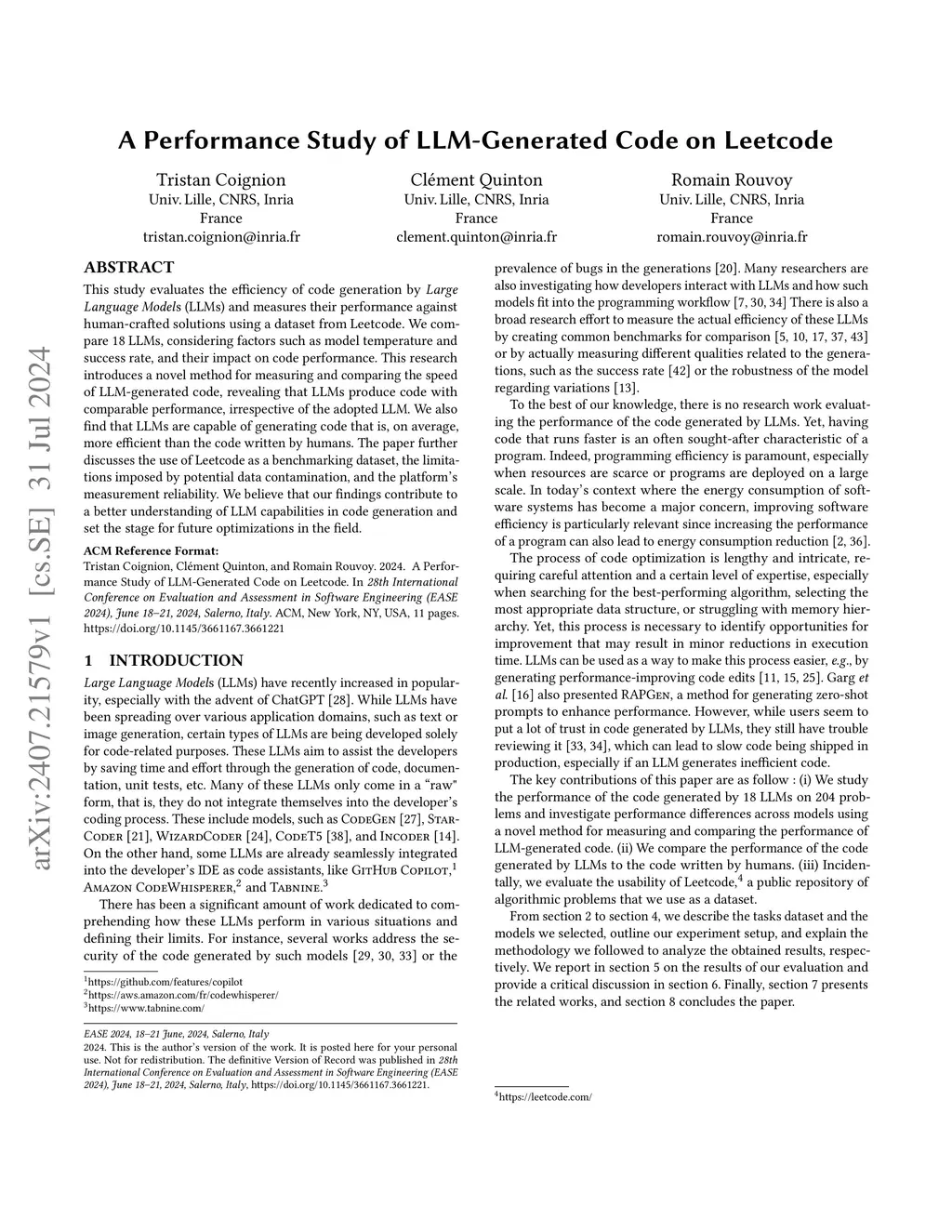 This study evaluates the efficiency of code generation by Large Language Models (LLMs) and measures their performance against human-crafted solutions using a dataset from Leetcode. We compare 18 LLMs, considering factors such as model temperature and success rate, and their impact on code performance. This research introduces a novel method for measuring and comparing the speed of LLM-generated code, revealing that LLMs produce code with comparable performance, irrespective of the adopted LLM. We also find that LLMs are capable of generating code that is, on average, more efficient than the code written by humans. The paper further discusses the use of Leetcode as a benchmarking dataset, the limitations imposed by potential data contamination, and the platform's measurement reliability. We believe that our findings contribute to a better understanding of LLM capabilities in code generation and set the stage for future optimizations in the field.