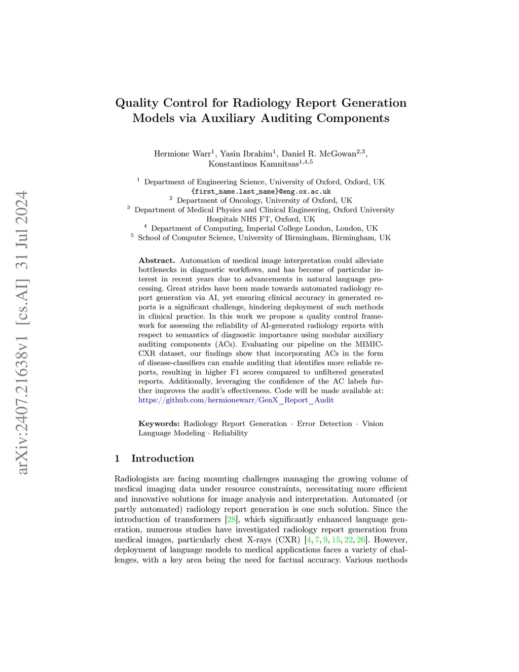 Quality Control for Radiology Report Generation Models via Auxiliary
