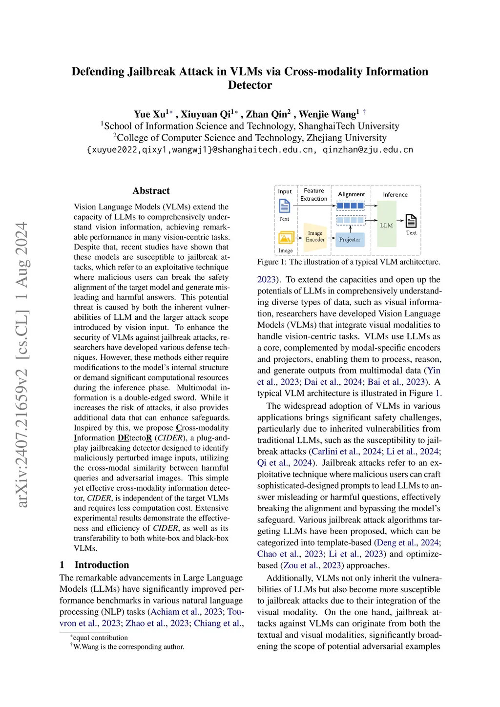Vision Language Models (VLMs) extend the capacity of LLMs to comprehensively understand vision information, achieving remarkable performance in many vision-centric tasks. Despite that, recent studies have shown that these models are susceptible to jailbreak attacks, which refer to an exploitative technique where malicious users can break the safety alignment of the target model and generate misleading and harmful answers. This potential threat is caused by both the inherent vulnerabilities of LLM and the larger attack scope introduced by vision input. To enhance the security of VLMs against jailbreak attacks, researchers have developed various defense techniques. However, these methods either require modifications to the model's internal structure or demand significant computational resources during the inference phase. Multimodal information is a double-edged sword. While it increases the risk of attacks, it also provides additional data that can enhance safeguards. Inspired by this, we propose ross-modality nformation tecto (, a plug-and-play jailbreaking detector designed to identify maliciously perturbed image inputs, utilizing the cross-modal similarity between harmful queries and adversarial images. This simple yet effective cross-modality information detector, , is independent of the target VLMs and requires less computation cost. Extensive experimental results demonstrate the effectiveness and efficiency of , as well as its transferability to both white-box and black-box VLMs.