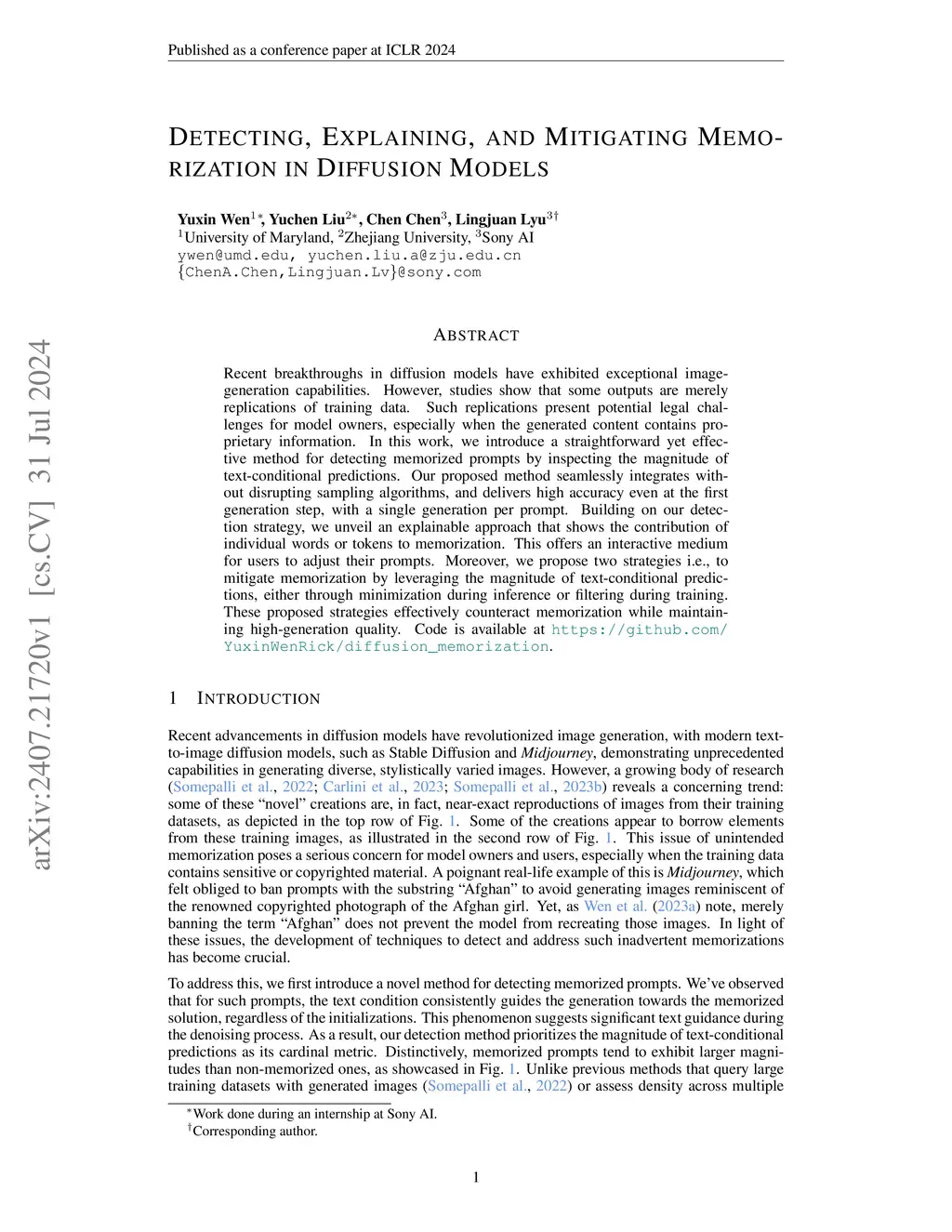 Recent breakthroughs in diffusion models have exhibited exceptional image-generation capabilities. However, studies show that some outputs are merely replications of training data. Such replications present potential legal challenges for model owners, especially when the generated content contains proprietary information. In this work, we introduce a straightforward yet effective method for detecting memorized prompts by inspecting the magnitude of text-conditional predictions. Our proposed method seamlessly integrates without disrupting sampling algorithms, and delivers high accuracy even at the first generation step, with a single generation per prompt. Building on our detection strategy, we unveil an explainable approach that shows the contribution of individual words or tokens to memorization. This offers an interactive medium for users to adjust their prompts. Moreover, we propose two strategies i.e., to mitigate memorization by leveraging the magnitude of text-conditional predictions, either through minimization during inference or filtering during training. These proposed strategies effectively counteract memorization while maintaining high-generation quality. Code is available at https://github.com/YuxinWenRick/diffusion_memorization.