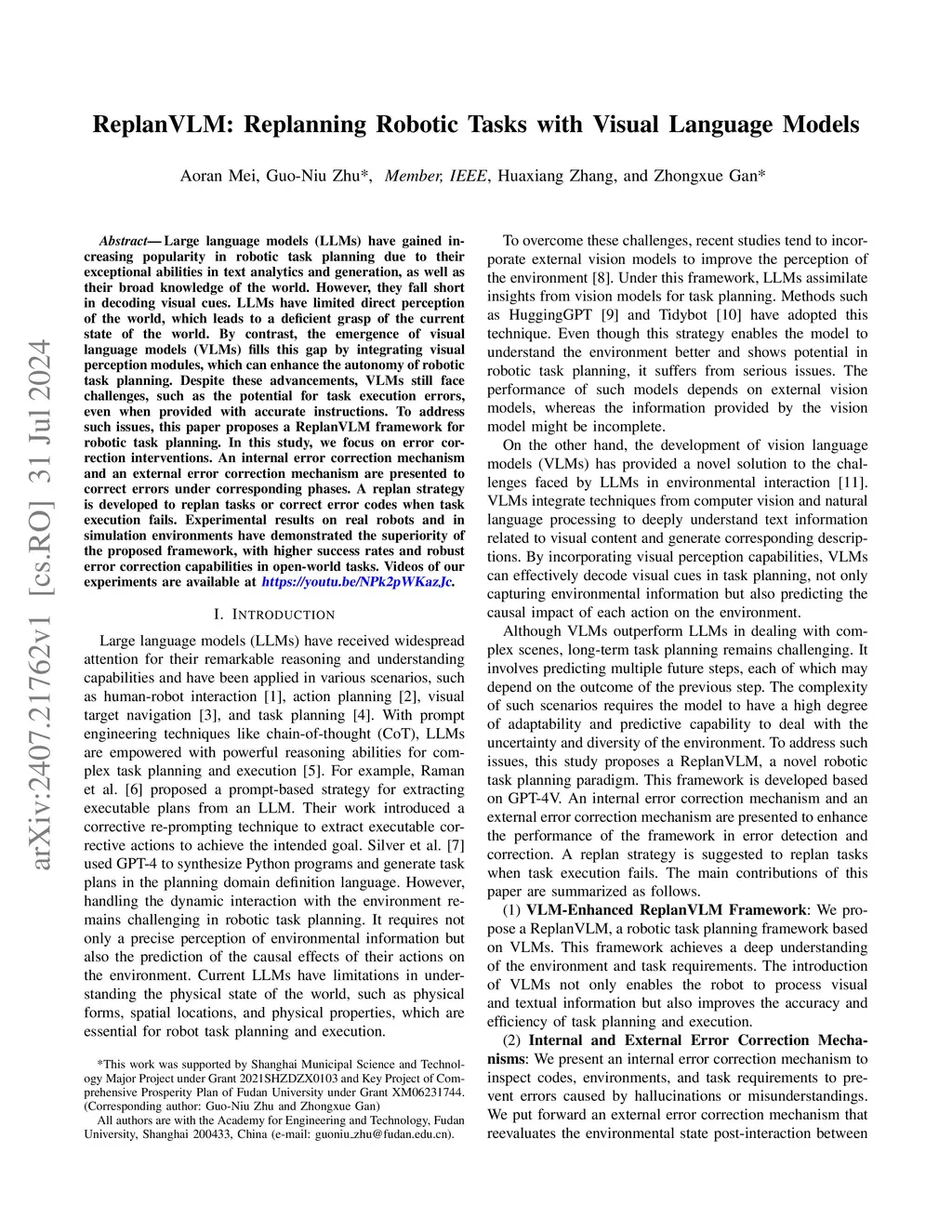 Large language models (LLMs) have gained increasing popularity in robotic task planning due to their exceptional abilities in text analytics and generation, as well as their broad knowledge of the world. However, they fall short in decoding visual cues. LLMs have limited direct perception of the world, which leads to a deficient grasp of the current state of the world. By contrast, the emergence of visual language models (VLMs) fills this gap by integrating visual perception modules, which can enhance the autonomy of robotic task planning. Despite these advancements, VLMs still face challenges, such as the potential for task execution errors, even when provided with accurate instructions. To address such issues, this paper proposes a ReplanVLM framework for robotic task planning. In this study, we focus on error correction interventions. An internal error correction mechanism and an external error correction mechanism are presented to correct errors under corresponding phases. A replan strategy is developed to replan tasks or correct error codes when task execution fails. Experimental results on real robots and in simulation environments have demonstrated the superiority of the proposed framework, with higher success rates and robust error correction capabilities in open-world tasks. Videos of our experiments are available at https://youtu.be/NPk2pWKazJc.