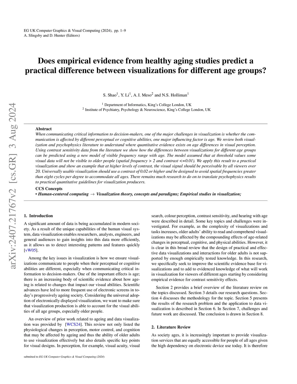 When communicating critical information to decision-makers, one of the major challenges in visualization is whether the communication is affected by different perceptual or cognitive abilities, one major influencing factor is age. We review both visualization and psychophysics literature to understand where quantitative evidence exists on age differences in visual perception. Using contrast sensitivity data from the literature we show how the differences between visualizations for different age groups can be predicted using a new model of visible frequency range with age. The model assumed that at threshold values some visual data will not be visible to older people (spatial frequency > 2 and contrast <=0.01). We apply this result to a practical visualization and show an example that at higher levels of contrast, the visual signal should be perceivable by all viewers over 20. Universally usable visualization should use a contrast of 0.02 or higher and be designed to avoid spatial frequencies greater than eight cycles per degree to accommodate all ages. There remains much research to do on to translate psychophysics results to practical quantitative guidelines for visualization producers.