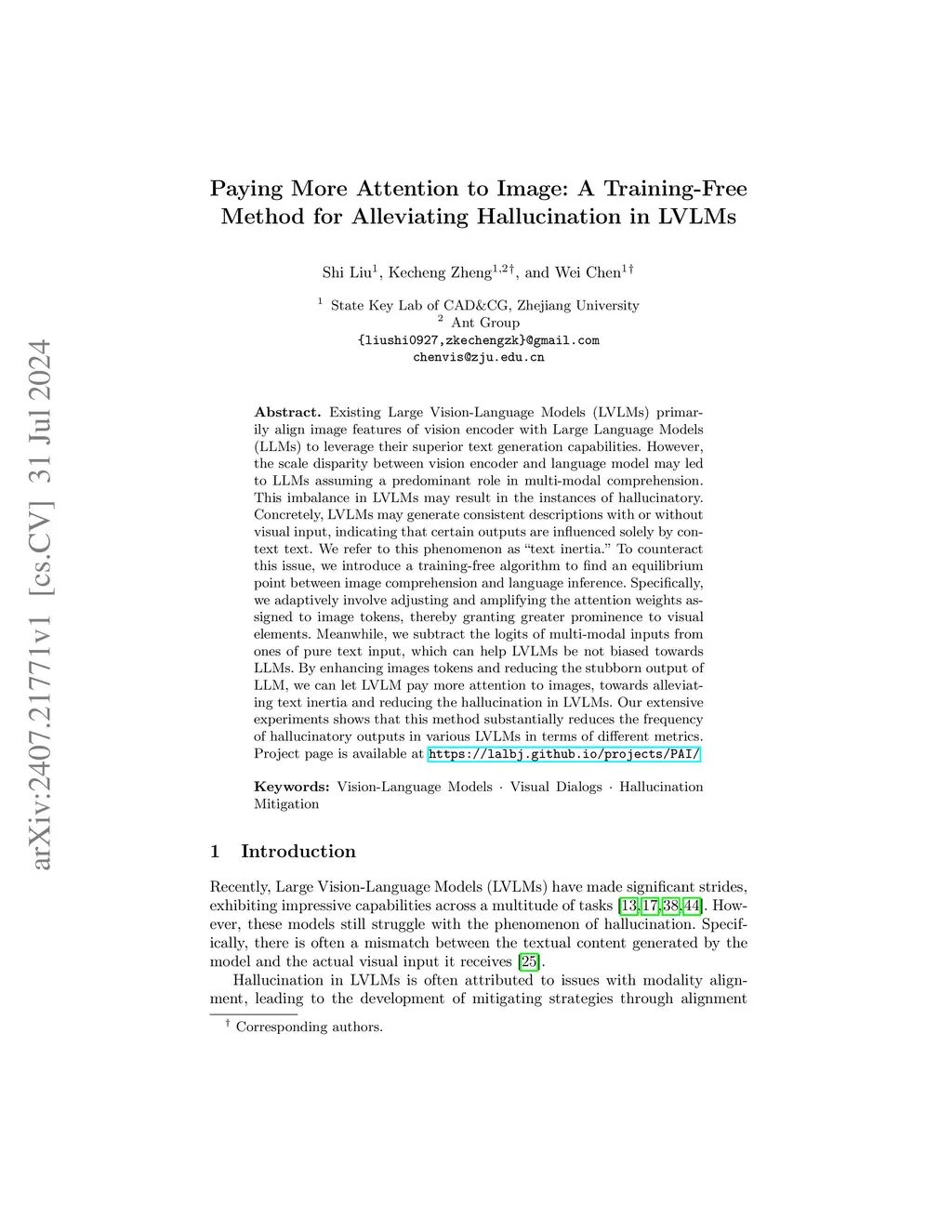 Existing Large Vision-Language Models (LVLMs) primarily align image features of vision encoder with Large Language Models (LLMs) to leverage their superior text generation capabilities. However, the scale disparity between vision encoder and language model may led to LLMs assuming a predominant role in multi-modal comprehension. This imbalance in LVLMs may result in the instances of hallucinatory. Concretely, LVLMs may generate consistent descriptions with or without visual input, indicating that certain outputs are influenced solely by context text. We refer to this phenomenon as "text inertia." To counteract this issue, we introduce a training-free algorithm to find an equilibrium point between image comprehension and language inference. Specifically, we adaptively involve adjusting and amplifying the attention weights assigned to image tokens, thereby granting greater prominence to visual elements. Meanwhile, we subtract the logits of multi-modal inputs from ones of pure text input, which can help LVLMs be not biased towards LLMs. By enhancing images tokens and reducing the stubborn output of LLM, we can let LVLM pay more attention to images, towards alleviating text inertia and reducing the hallucination in LVLMs. Our extensive experiments shows that this method substantially reduces the frequency of hallucinatory outputs in various LVLMs in terms of different metrics. Project page is available at https://lalbj.github.io/projects/PAI/.