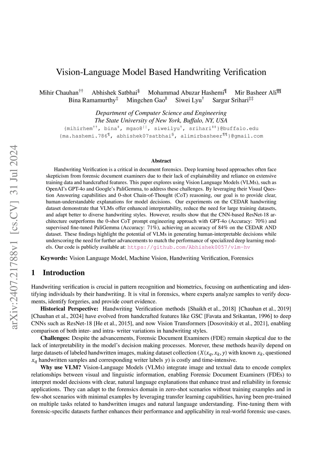 Handwriting Verification is a critical in document forensics. Deep learning based approaches often face skepticism from forensic document examiners due to their lack of explainability and reliance on extensive training data and handcrafted features. This paper explores using Vision Language Models (VLMs), such as OpenAI's GPT-4o and Google's PaliGemma, to address these challenges. By leveraging their Visual Question Answering capabilities and 0-shot Chain-of-Thought (CoT) reasoning, our goal is to provide clear, human-understandable explanations for model decisions. Our experiments on the CEDAR handwriting dataset demonstrate that VLMs offer enhanced interpretability, reduce the need for large training datasets, and adapt better to diverse handwriting styles. However, results show that the CNN-based ResNet-18 architecture outperforms the 0-shot CoT prompt engineering approach with GPT-4o (Accuracy: 70%) and supervised fine-tuned PaliGemma (Accuracy: 71%), achieving an accuracy of 84% on the CEDAR AND dataset. These findings highlight the potential of VLMs in generating human-interpretable decisions while underscoring the need for further advancements to match the performance of specialized deep learning models.