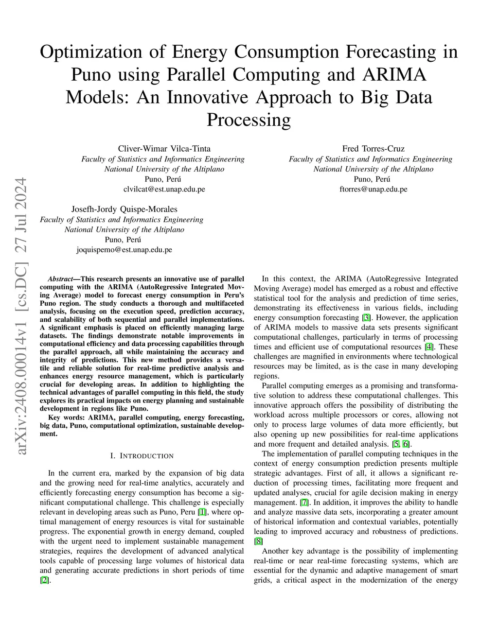 This research presents an innovative use of parallel computing with the ARIMA (AutoRegressive Integrated Moving Average) model to forecast energy consumption in Peru's Puno region. The study conducts a thorough and multifaceted analysis, focusing on the execution speed, prediction accuracy, and scalability of both sequential and parallel implementations. A significant emphasis is placed on efficiently managing large datasets. The findings demonstrate notable improvements in computational efficiency and data processing capabilities through the parallel approach, all while maintaining the accuracy and integrity of predictions. This new method provides a versatile and reliable solution for real-time predictive analysis and enhances energy resource management, which is particularly crucial for developing areas. In addition to highlighting the technical advantages of parallel computing in this field, the study explores its practical impacts on energy planning and sustainable development in regions like Puno.