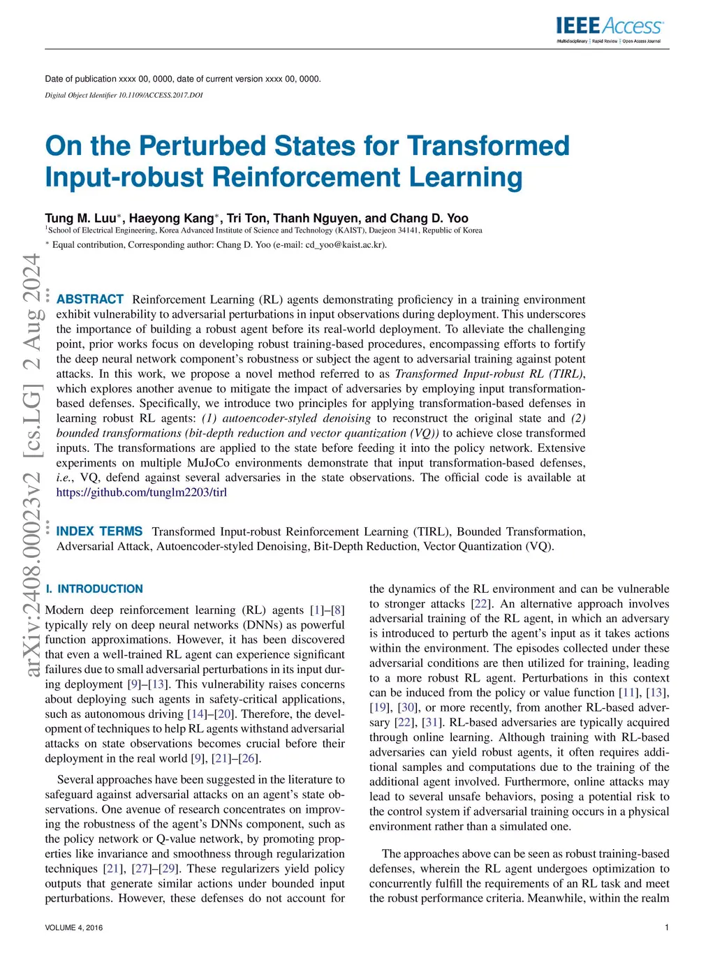 Reinforcement Learning (RL) agents demonstrating proficiency in a training environment exhibit vulnerability to adversarial perturbations in input observations during deployment. This underscores the importance of building a robust agent before its real-world deployment. To alleviate the challenging point, prior works focus on developing robust training-based procedures, encompassing efforts to fortify the deep neural network component's robustness or subject the agent to adversarial training against potent attacks. In this work, we propose a novel method referred to as \textit{Transformed Input-robust RL (TIRL)}, which explores another avenue to mitigate the impact of adversaries by employing input transformation-based defenses. Specifically, we introduce two principles for applying transformation-based defenses in learning robust RL agents: \textit{(1) autoencoder-styled denoising} to reconstruct the original state and \textit{(2) bounded transformations (bit-depth reduction and vector quantization (VQ))} to achieve close transformed inputs. The transformations are applied to the state before feeding it into the policy network. Extensive experiments on multiple \mujoco environments demonstrate that input transformation-based defenses, \ie, VQ, defend against several adversaries in the state observations.