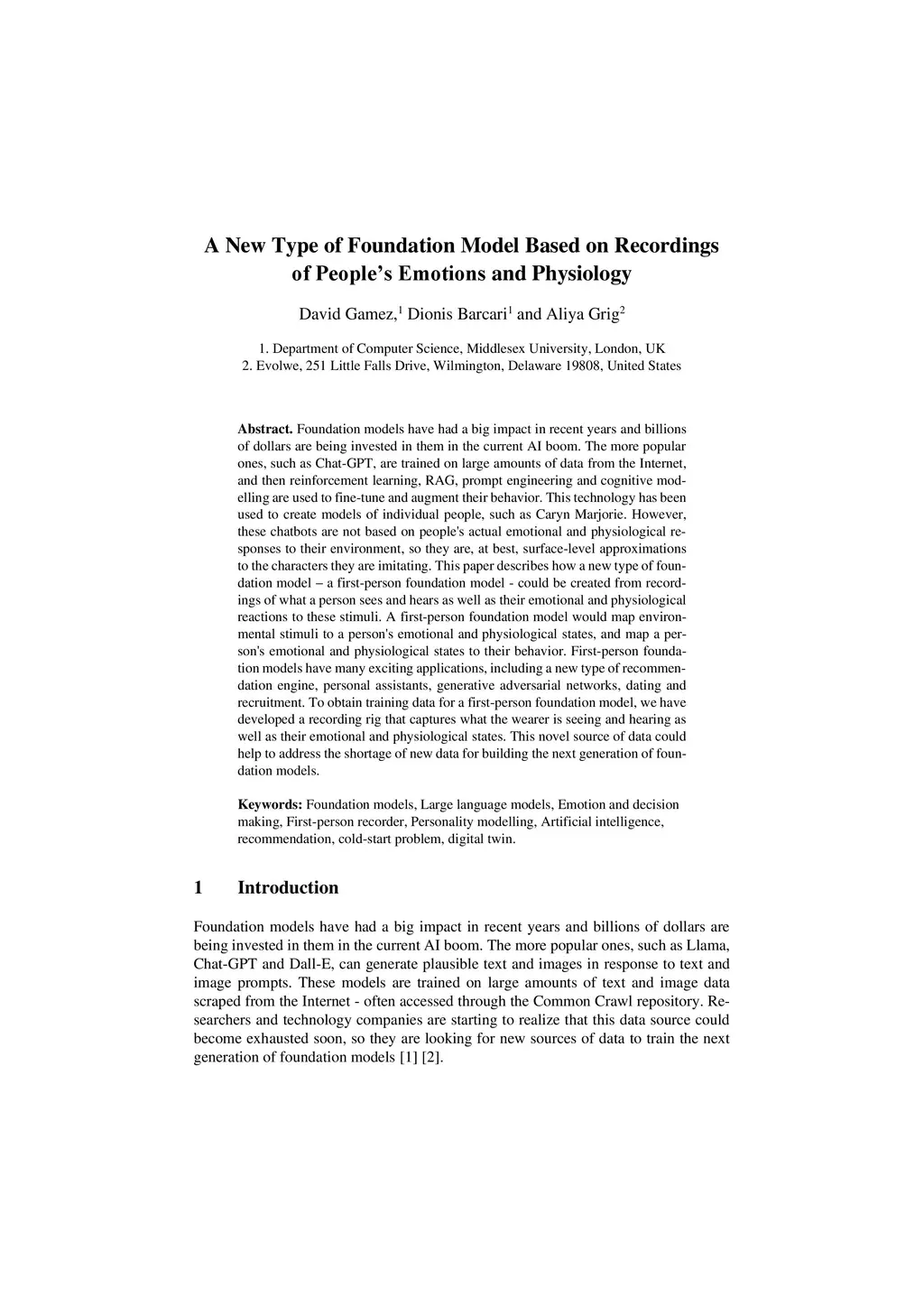 Foundation models have had a big impact in recent years and billions of dollars are being invested in them in the current AI boom. The more popular ones, such as Chat-GPT, are trained on large amounts of data from the Internet, and then reinforcement learning, RAG, prompt engineering and cognitive modelling are used to fine-tune and augment their behavior. This technology has been used to create models of individual people, such as Caryn Marjorie. However, these chatbots are not based on people's actual emotional and physiological responses to their environment, so they are, at best, surface-level approximations to the characters they are imitating. This paper describes how a new type of foundation model - a first-person foundation model - could be created from recordings of what a person sees and hears as well as their emotional and physiological reactions to these stimuli. A first-person foundation model would map environmental stimuli to a person's emotional and physiological states, and map a person's emotional and physiological states to their behavior. First-person foundation models have many exciting applications, including a new type of recommendation engine, personal assistants, generative adversarial networks, dating and recruitment. To obtain training data for a first-person foundation model, we have developed a recording rig that captures what the wearer is seeing and hearing as well as their emotional and physiological states. This novel source of data could help to address the shortage of new data for building the next generation of foundation models.