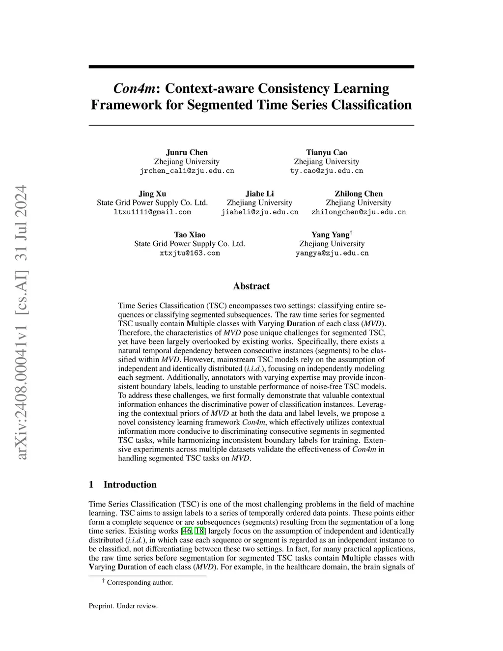 Time Series Classification (TSC) encompasses two settings: classifying entire sequences or classifying segmented subsequences. The raw time series for segmented TSC usually contain Multiple classes with Varying Duration of each class (MVD). Therefore, the characteristics of MVD pose unique challenges for segmented TSC, yet have been largely overlooked by existing works. Specifically, there exists a natural temporal dependency between consecutive instances (segments) to be classified within MVD. However, mainstream TSC models rely on the assumption of independent and identically distributed (i.i.d.), focusing on independently modeling each segment. Additionally, annotators with varying expertise may provide inconsistent boundary labels, leading to unstable performance of noise-free TSC models. To address these challenges, we first formally demonstrate that valuable contextual information enhances the discriminative power of classification instances. Leveraging the contextual priors of MVD at both the data and label levels, we propose a novel consistency learning framework Con4m, which effectively utilizes contextual information more conducive to discriminating consecutive segments in segmented TSC tasks, while harmonizing inconsistent boundary labels for training. Extensive experiments across multiple datasets validate the effectiveness of Con4m in handling segmented TSC tasks on MVD. The source code is available atthis https URL.