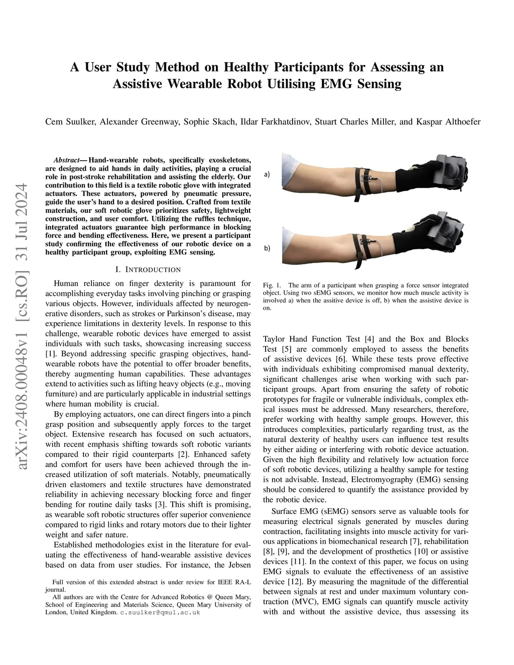 Hand-wearable robots, specifically exoskeletons, are designed to aid hands in daily activities, playing a crucial role in post-stroke rehabilitation and assisting the elderly. Our contribution to this field is a textile robotic glove with integrated actuators. These actuators, powered by pneumatic pressure, guide the user's hand to a desired position. Crafted from textile materials, our soft robotic glove prioritizes safety, lightweight construction, and user comfort. Utilizing the ruffles technique, integrated actuators guarantee high performance in blocking force and bending effectiveness. Here, we present a participant study confirming the effectiveness of our robotic device on a healthy participant group, exploiting EMG sensing.
