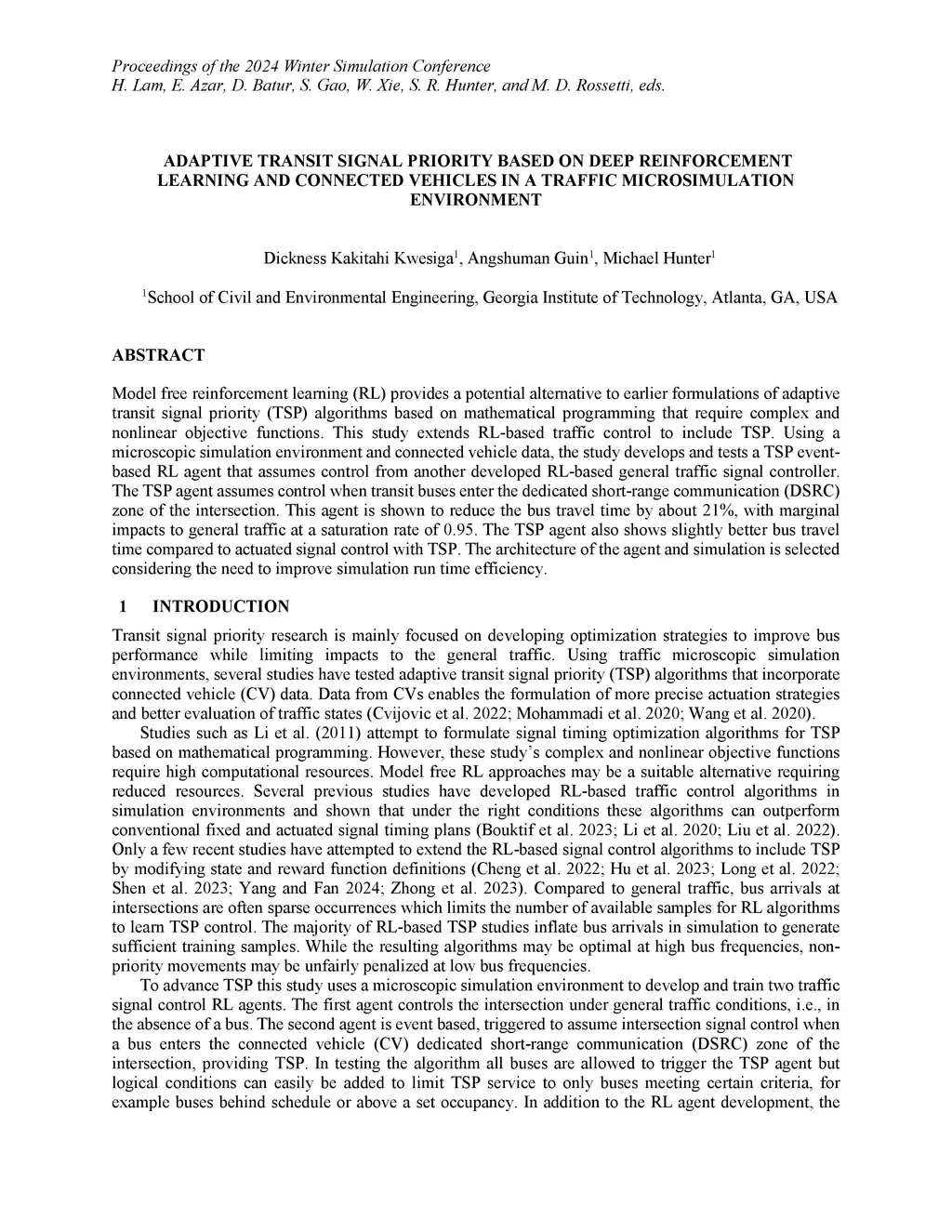 Model free reinforcement learning (RL) provides a potential alternative to earlier formulations of adaptive transit signal priority (TSP) algorithms based on mathematical programming that require complex and nonlinear objective functions. This study extends RL - based traffic control to include TSP. Using a microscopic simulation environment and connected vehicle data, the study develops and tests a TSP event-based RL agent that assumes control from another developed RL - based general traffic signal controller. The TSP agent assumes control when transit buses enter the dedicated short-range communication (DSRC) zone of the intersection. This agent is shown to reduce the bus travel time by about 21%, with marginal impacts to general traffic at a saturation rate of 0.95. The TSP agent also shows slightly better bus travel time compared to actuated signal control with TSP. The architecture of the agent and simulation is selected considering the need to improve simulation run time efficiency.