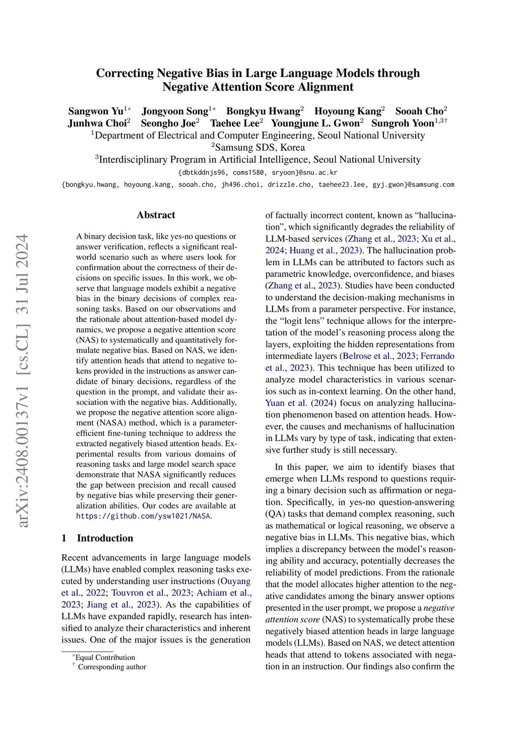 Correcting Negative Bias in Large Language Models through Negative Attention Score Alignment