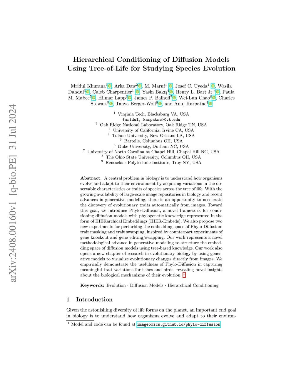 A central problem in biology is to understand how organisms evolve and adapt to their environment by acquiring variations in the observable characteristics or traits of species across the tree of life. With the growing availability of large-scale image repositories in biology and recent advances in generative modeling, there is an opportunity to accelerate the discovery of evolutionary traits automatically from images. Toward this goal, we introduce Phylo-Diffusion, a novel framework for conditioning diffusion models with phylogenetic knowledge represented in the form of HIERarchical Embeddings (HIER-Embeds). We also propose two new experiments for perturbing the embedding space of Phylo-Diffusion: trait masking and trait swapping, inspired by counterpart experiments of gene knockout and gene editing/swapping. Our work represents a novel methodological advance in generative modeling to structure the embedding space of diffusion models using tree-based knowledge. Our work also opens a new chapter of research in evolutionary biology by using generative models to visualize evolutionary changes directly from images. We empirically demonstrate the usefulness of Phylo-Diffusion in capturing meaningful trait variations for fishes and birds, revealing novel insights about the biological mechanisms of their evolution.