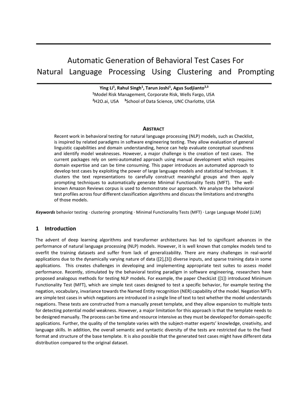 Automatic Generation of Behavioral Test Cases For Natural Language Processing Using Clustering and Prompting