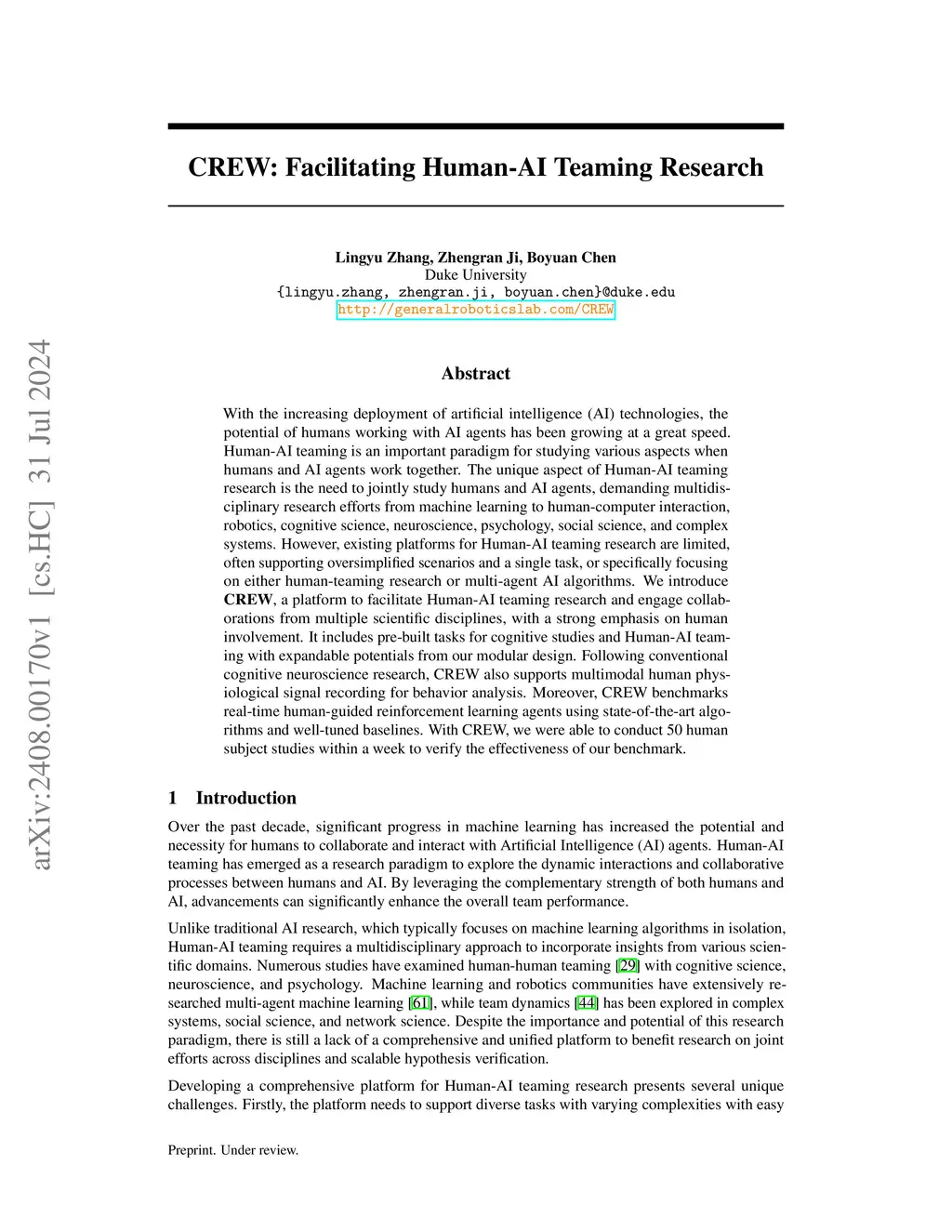 With the increasing deployment of artificial intelligence (AI) technologies, the potential of humans working with AI agents has been growing at a great speed. Human-AI teaming is an important paradigm for studying various aspects when humans and AI agents work together. The unique aspect of Human-AI teaming research is the need to jointly study humans and AI agents, demanding multidisciplinary research efforts from machine learning to human-computer interaction, robotics, cognitive science, neuroscience, psychology, social science, and complex systems. However, existing platforms for Human-AI teaming research are limited, often supporting oversimplified scenarios and a single task, or specifically focusing on either human-teaming research or multi-agent AI algorithms. We introduce CREW, a platform to facilitate Human-AI teaming research in real-time decision-making scenarios and engage collaborations from multiple scientific disciplines, with a strong emphasis on human involvement. It includes pre-built tasks for cognitive studies and Human-AI teaming with expandable potentials from our modular design. Following conventional cognitive neuroscience research, CREW also supports multimodal human physiological signal recording for behavior analysis. Moreover, CREW benchmarks real-time human-guided reinforcement learning agents using state-of-the-art algorithms and well-tuned baselines. With CREW, we were able to conduct 50 human subject studies within a week to verify the effectiveness of our benchmark.