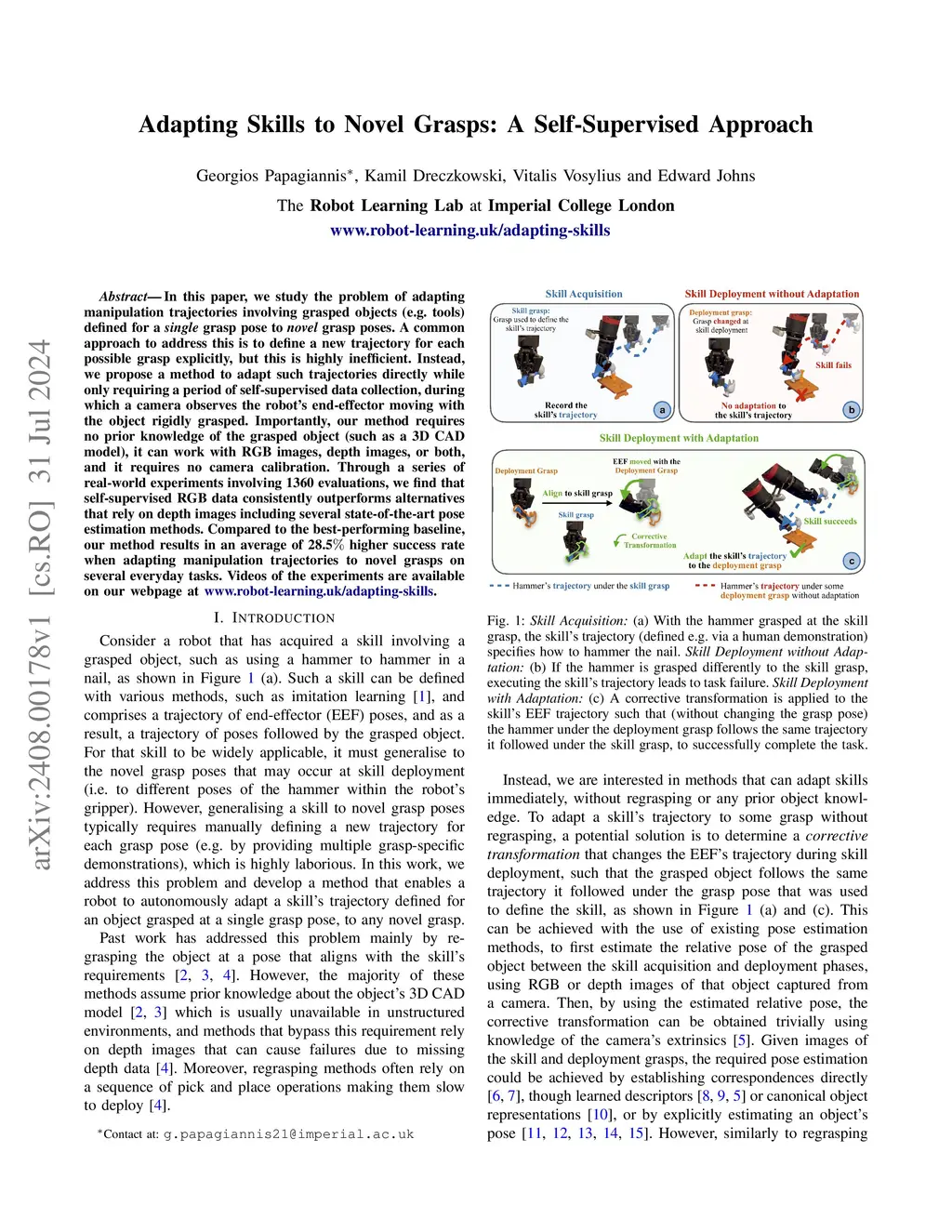 Adapting Skills to Novel Grasps: A Self-Supervised Approach