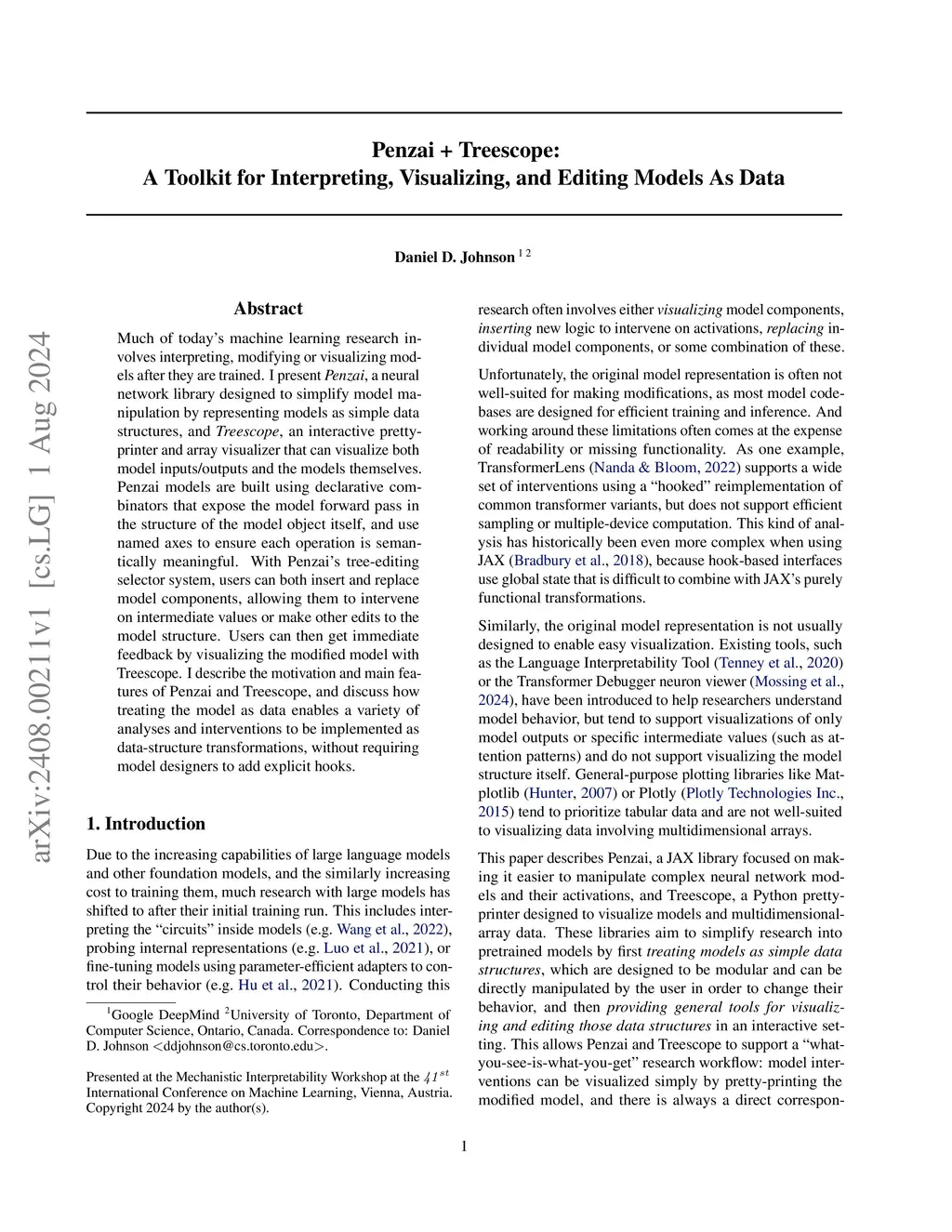 Much of today's machine learning research involves interpreting, modifying or visualizing models after they are trained. I present Penzai, a neural network library designed to simplify model manipulation by representing models as simple data structures, and Treescope, an interactive pretty-printer and array visualizer that can visualize both model inputs/outputs and the models themselves. Penzai models are built using declarative combinators that expose the model forward pass in the structure of the model object itself, and use named axes to ensure each operation is semantically meaningful. With Penzai's tree-editing selector system, users can both insert and replace model components, allowing them to intervene on intermediate values or make other edits to the model structure. Users can then get immediate feedback by visualizing the modified model with Treescope. I describe the motivation and main features of Penzai and Treescope, and discuss how treating the model as data enables a variety of analyses and interventions to be implemented as data-structure transformations, without requiring model designers to add explicit hooks.