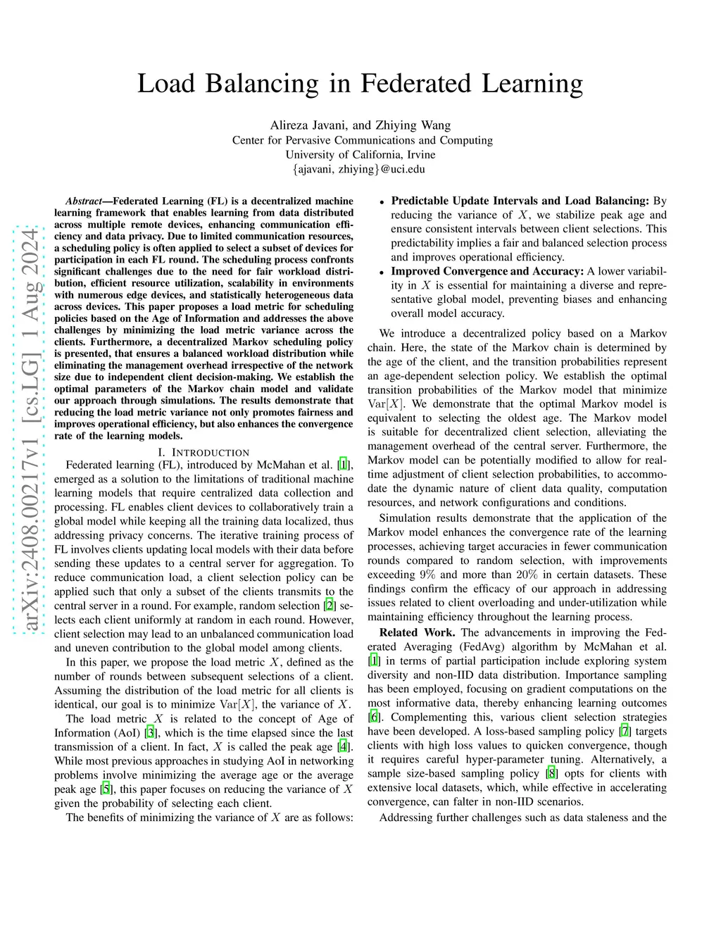 Federated Learning (FL) is a decentralized machine learning framework that enables learning from data distributed across multiple remote devices, enhancing communication efficiency and data privacy. Due to limited communication resources, a scheduling policy is often applied to select a subset of devices for participation in each FL round. The scheduling process confronts significant challenges due to the need for fair workload distribution, efficient resource utilization, scalability in environments with numerous edge devices, and statistically heterogeneous data across devices. This paper proposes a load metric for scheduling policies based on the Age of Information and addresses the above challenges by minimizing the load metric variance across the clients. Furthermore, a decentralized Markov scheduling policy is presented, that ensures a balanced workload distribution while eliminating the management overhead irrespective of the network size due to independent client decision-making. We establish the optimal parameters of the Markov chain model and validate our approach through simulations. The results demonstrate that reducing the load metric variance not only promotes fairness and improves operational efficiency, but also enhances the convergence rate of the learning models.