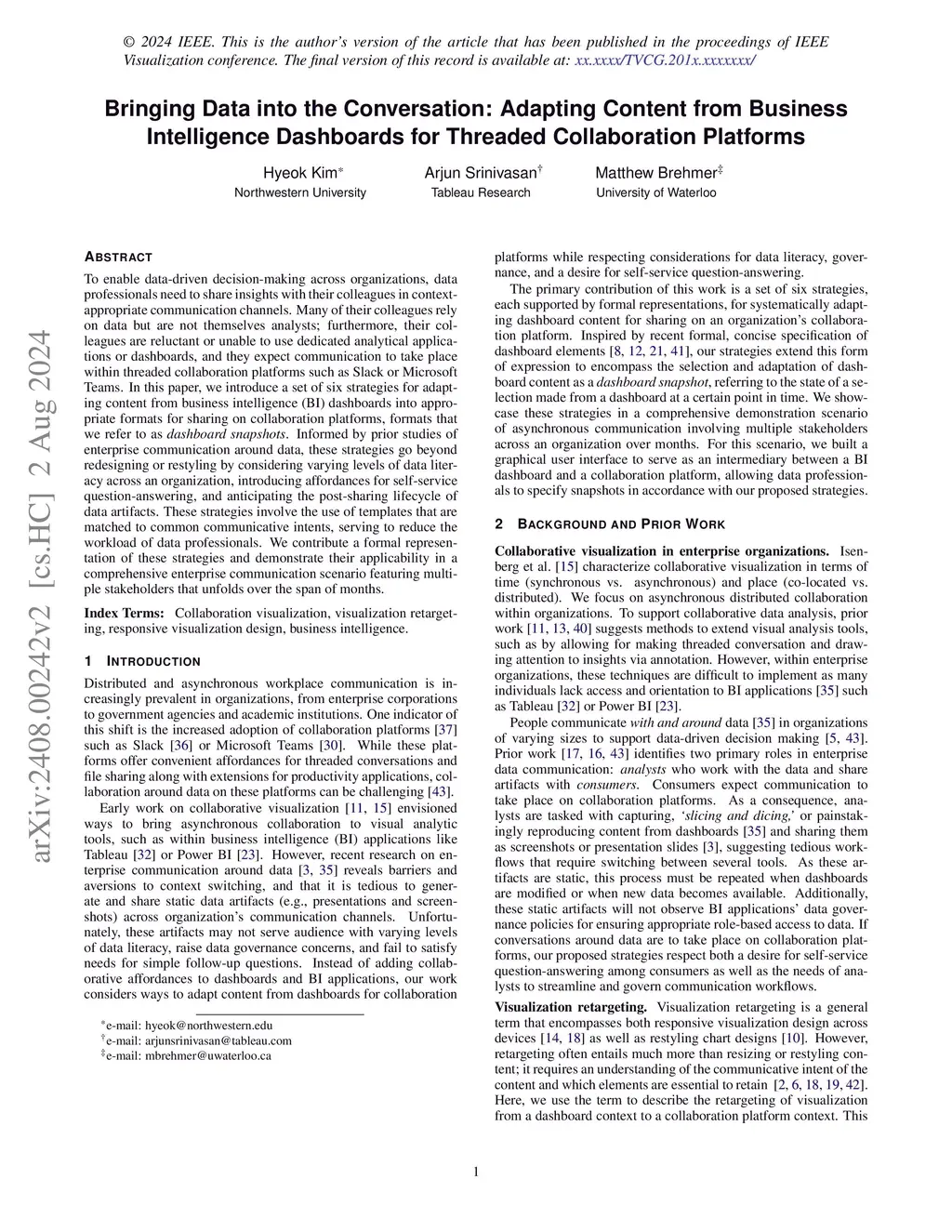 To enable data-driven decision-making across organizations, data professionals need to share insights with their colleagues in context-appropriate communication channels. Many of their colleagues rely on data but are not themselves analysts; furthermore, their colleagues are reluctant or unable to use dedicated analytical applications or dashboards, and they expect communication to take place within threaded collaboration platforms such as Slack or Microsoft Teams. In this paper, we introduce a set of six strategies for adapting content from business intelligence (BI) dashboards into appropriate formats for sharing on collaboration platforms, formats that we refer to as dashboard snapshots. Informed by prior studies of enterprise communication around data, these strategies go beyond redesigning or restyling by considering varying levels of data literacy across an organization, introducing affordances for self-service question-answering, and anticipating the post-sharing lifecycle of data artifacts. These strategies involve the use of templates that are matched to common communicative intents, serving to reduce the workload of data professionals. We contribute a formal representation of these strategies and demonstrate their applicability in a comprehensive enterprise communication scenario featuring multiple stakeholders that unfolds over the span of months.