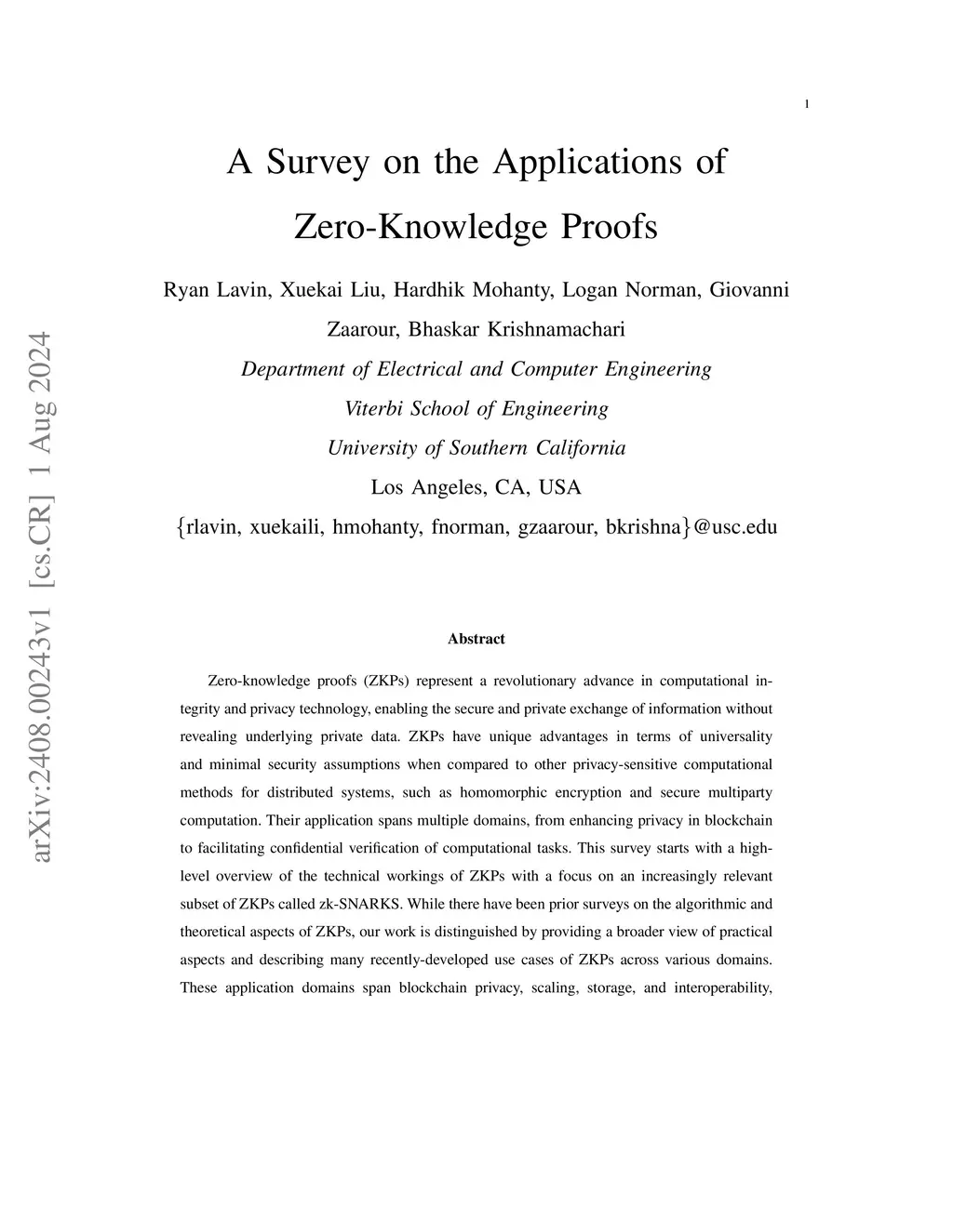 A Survey on the Applications of Zero-Knowledge Proofs