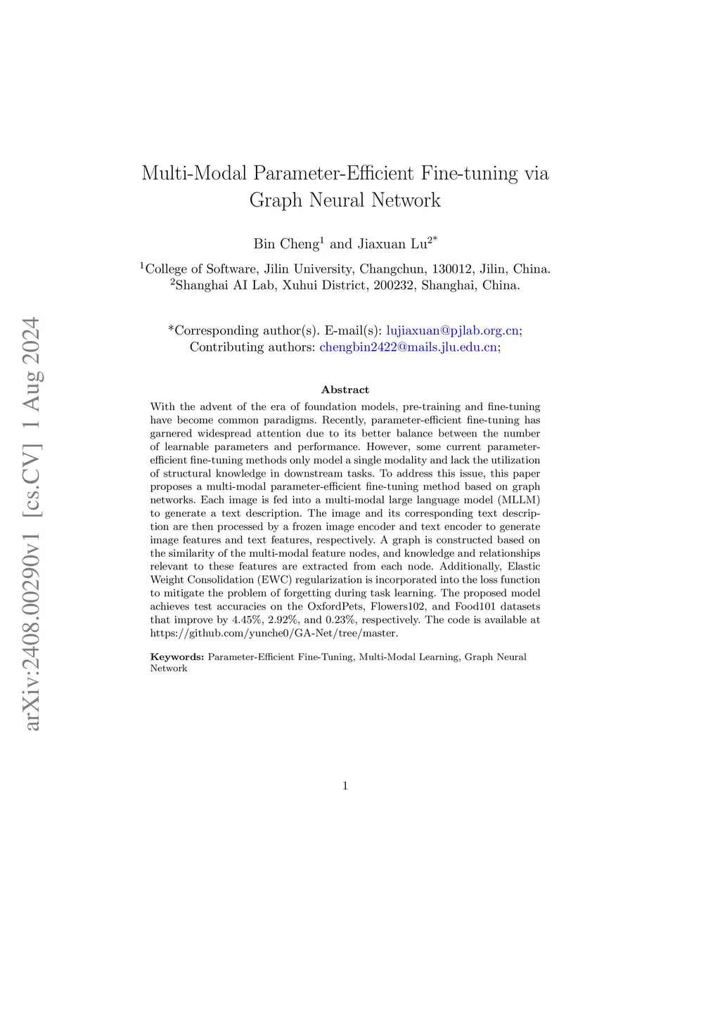 With the advent of the era of foundation models, pre-training and fine-tuning have become common paradigms. Recently, parameter-efficient fine-tuning has garnered widespread attention due to its better balance between the number of learnable parameters and performance. However, some current parameter-efficient fine-tuning methods only model a single modality and lack the utilization of structural knowledge in downstream tasks. To address this issue, this paper proposes a multi-modal parameter-efficient fine-tuning method based on graph networks. Each image is fed into a multi-modal large language model (MLLM) to generate a text description. The image and its corresponding text description are then processed by a frozen image encoder and text encoder to generate image features and text features, respectively. A graph is constructed based on the similarity of the multi-modal feature nodes, and knowledge and relationships relevant to these features are extracted from each node. Additionally, Elastic Weight Consolidation (EWC) regularization is incorporated into the loss function to mitigate the problem of forgetting during task learning. The proposed model achieves test accuracies on the OxfordPets, Flowers102, and Food101 datasets that improve by 4.45%, 2.92%, and 0.23%, respectively. The code is available at https://github.com/yunche0/GA-Net/tree/master.