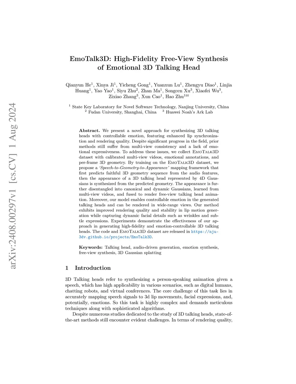 We present a novel approach for synthesizing 3D talking heads with controllable emotion, featuring enhanced lip synchronization and rendering quality. Despite significant progress in the field, prior methods still suffer from multi-view consistency and a lack of emotional expressiveness. To address these issues, we collect EmoTalk3D dataset with calibrated multi-view videos, emotional annotations, and per-frame 3D geometry. By training on the EmoTalk3D dataset, we propose a \textit{`Speech-to-Geometry-to-Appearance'} mapping framework that first predicts faithful 3D geometry sequence from the audio features, then the appearance of a 3D talking head represented by 4D Gaussians is synthesized from the predicted geometry. The appearance is further disentangled into canonical and dynamic Gaussians, learned from multi-view videos, and fused to render free-view talking head animation. Moreover, our model enables controllable emotion in the generated talking heads and can be rendered in wide-range views. Our method exhibits improved rendering quality and stability in lip motion generation while capturing dynamic facial details such as wrinkles and subtle expressions. Experiments demonstrate the effectiveness of our approach in generating high-fidelity and emotion-controllable 3D talking heads. The code and EmoTalk3D dataset are released at https://nju-3dv.github.io/projects/EmoTalk3D.