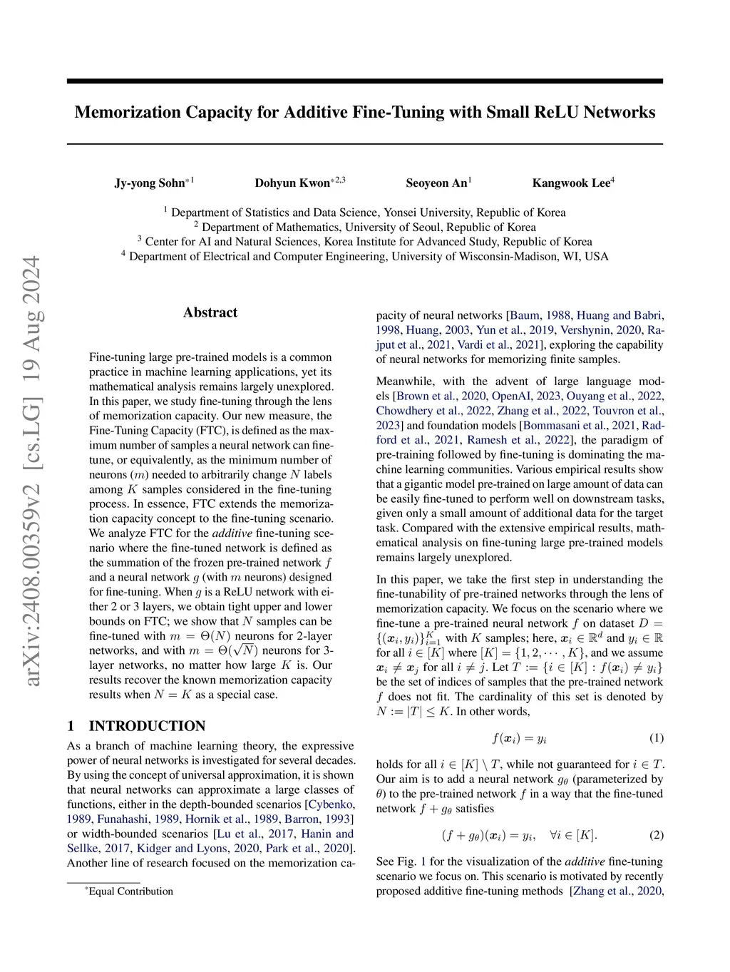 Fine-tuning large pre-trained models is a common practice in machine learning applications, yet its mathematical analysis remains largely unexplored. In this paper, we study fine-tuning through the lens of memorization capacity. Our new measure, the Fine-Tuning Capacity (FTC), is defined as the maximum number of samples a neural network can fine-tune, or equivalently, as the minimum number of neurons () needed to arbitrarily change labels among samples considered in the fine-tuning process. In essence, FTC extends the memorization capacity concept to the fine-tuning scenario. We analyze FTC for the additive fine-tuning scenario where the fine-tuned network is defined as the summation of the frozen pre-trained network and a neural network (with neurons) designed for fine-tuning. When is a ReLU network with either 2 or 3 layers, we obtain tight upper and lower bounds on FTC; we show that samples can be fine-tuned with neurons for 2-layer networks, and with neurons for 3-layer networks, no matter how large is. Our results recover the known memorization capacity results when as a special case.
