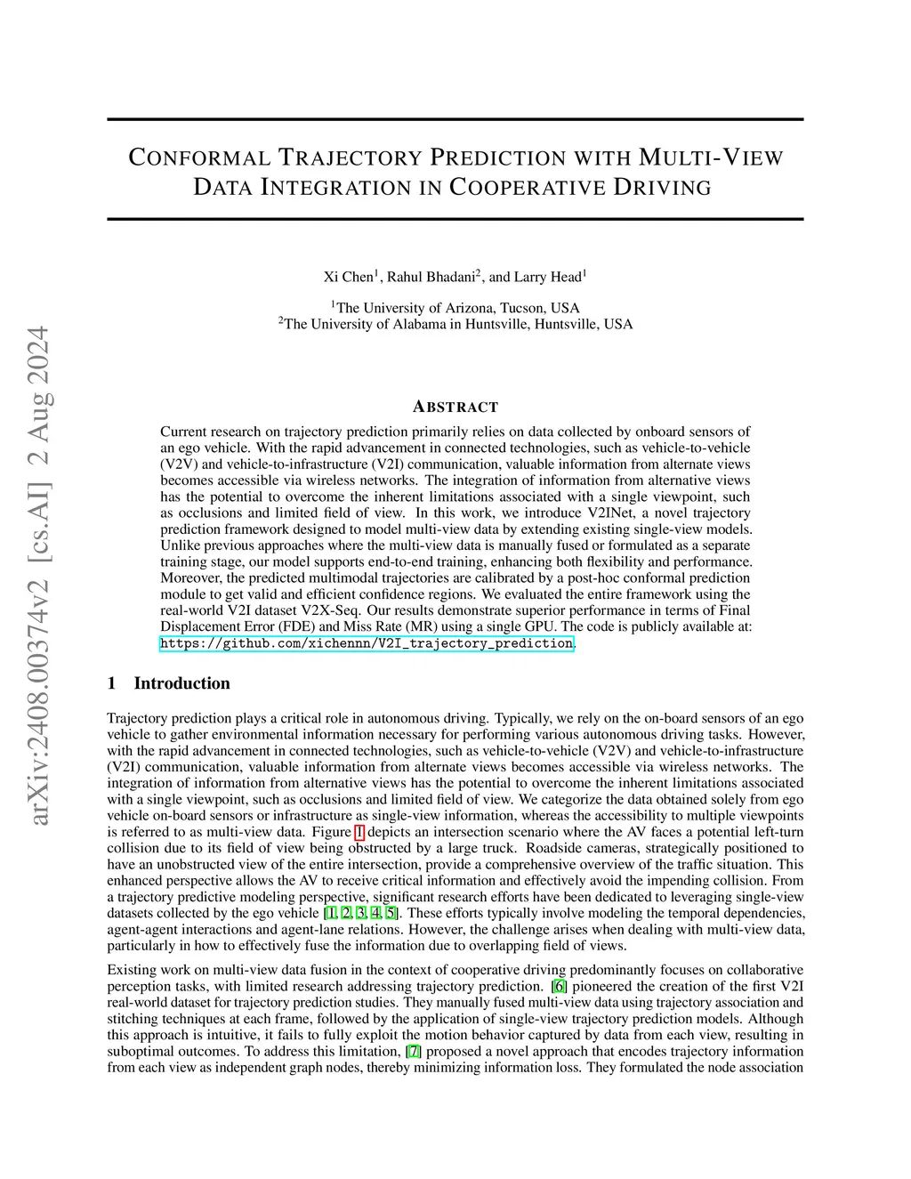 Current research on trajectory prediction primarily relies on data collected by onboard sensors of an ego vehicle. With the rapid advancement in connected technologies, such as vehicle-to-vehicle (V2V) and vehicle-to-infrastructure (V2I) communication, valuable information from alternate views becomes accessible via wireless networks. The integration of information from alternative views has the potential to overcome the inherent limitations associated with a single viewpoint, such as occlusions and limited field of view. In this work, we introduce V2INet, a novel trajectory prediction framework designed to model multi-view data by extending existing single-view models. Unlike previous approaches where the multi-view data is manually fused or formulated as a separate training stage, our model supports end-to-end training, enhancing both flexibility and performance. Moreover, the predicted multimodal trajectories are calibrated by a post-hoc conformal prediction module to get valid and efficient confidence regions. We evaluated the entire framework using the real-world V2I dataset V2X-Seq. Our results demonstrate superior performance in terms of Final Displacement Error (FDE) and Miss Rate (MR) using a single GPU. The code is publicly available at:this https URL.