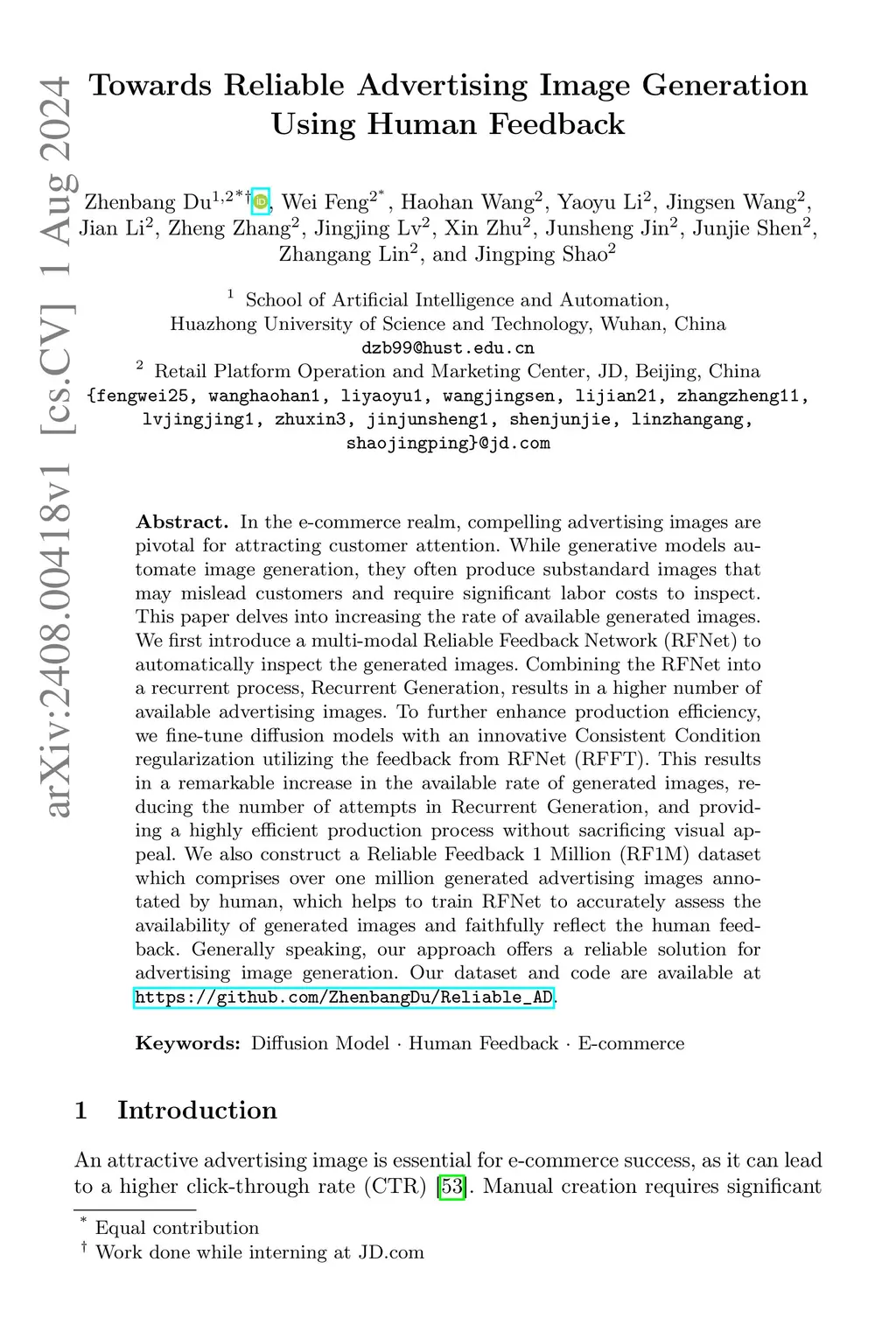 In the e-commerce realm, compelling advertising images are pivotal for attracting customer attention. While generative models automate image generation, they often produce substandard images that may mislead customers and require significant labor costs to inspect. This paper delves into increasing the rate of available generated images. We first introduce a multi-modal Reliable Feedback Network (RFNet) to automatically inspect the generated images. Combining the RFNet into a recurrent process, Recurrent Generation, results in a higher number of available advertising images. To further enhance production efficiency, we fine-tune diffusion models with an innovative Consistent Condition regularization utilizing the feedback from RFNet (RFFT). This results in a remarkable increase in the available rate of generated images, reducing the number of attempts in Recurrent Generation, and providing a highly efficient production process without sacrificing visual appeal. We also construct a Reliable Feedback 1 Million (RF1M) dataset which comprises over one million generated advertising images annotated by human, which helps to train RFNet to accurately assess the availability of generated images and faithfully reflect the human feedback. Generally speaking, our approach offers a reliable solution for advertising image generation.