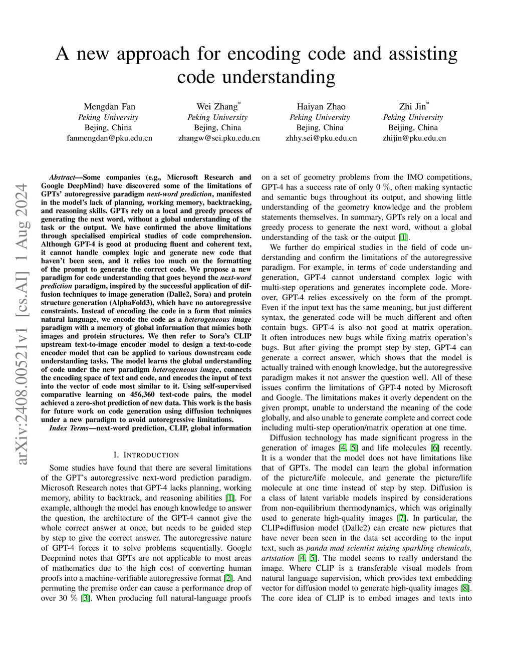 Some companies (e.g., Microsoft Research and Google DeepMind) have discovered some of the limitations of GPTs' autoregressive paradigm next-word prediction, manifested in the model's lack of planning, working memory, backtracking, and reasoning skills. GPTs rely on a local and greedy process of generating the next word, without a global understanding of the task or the output. We have confirmed the above limitations through specialized empirical studies of code comprehension. Although GPT-4 is good at producing fluent and coherent text, it cannot handle complex logic and generate new code that hasn't been seen, and it relies too much on the formatting of the prompt to generate the correct code. We propose a new paradigm for code understanding that goes beyond the next-word prediction paradigm, inspired by the successful application of diffusion techniques to image generation (Dalle-2, Sora) and protein structure generation (AlphaFold-3), which have no autoregressive constraints. Instead of encoding the code in a form that mimics natural language, we encode the code as a heterogeneous image paradigm with a memory of global information that mimics both images and protein structures. We then refer to Sora's CLIP upstream text-to-image encoder model to design a text-to-code encoder model that can be applied to various downstream code understanding tasks. The model learns the global understanding of code under the new paradigm heterogeneous image, connects the encoding space of text and code, and encodes the input of text into the vector of code most similar to it. Using self-supervised comparative learning on 456,360 text-code pairs, the model achieved a zero-shot prediction of new data. This work is the basis for future work on code generation using diffusion techniques under a new paradigm to avoid autoregressive limitations.
