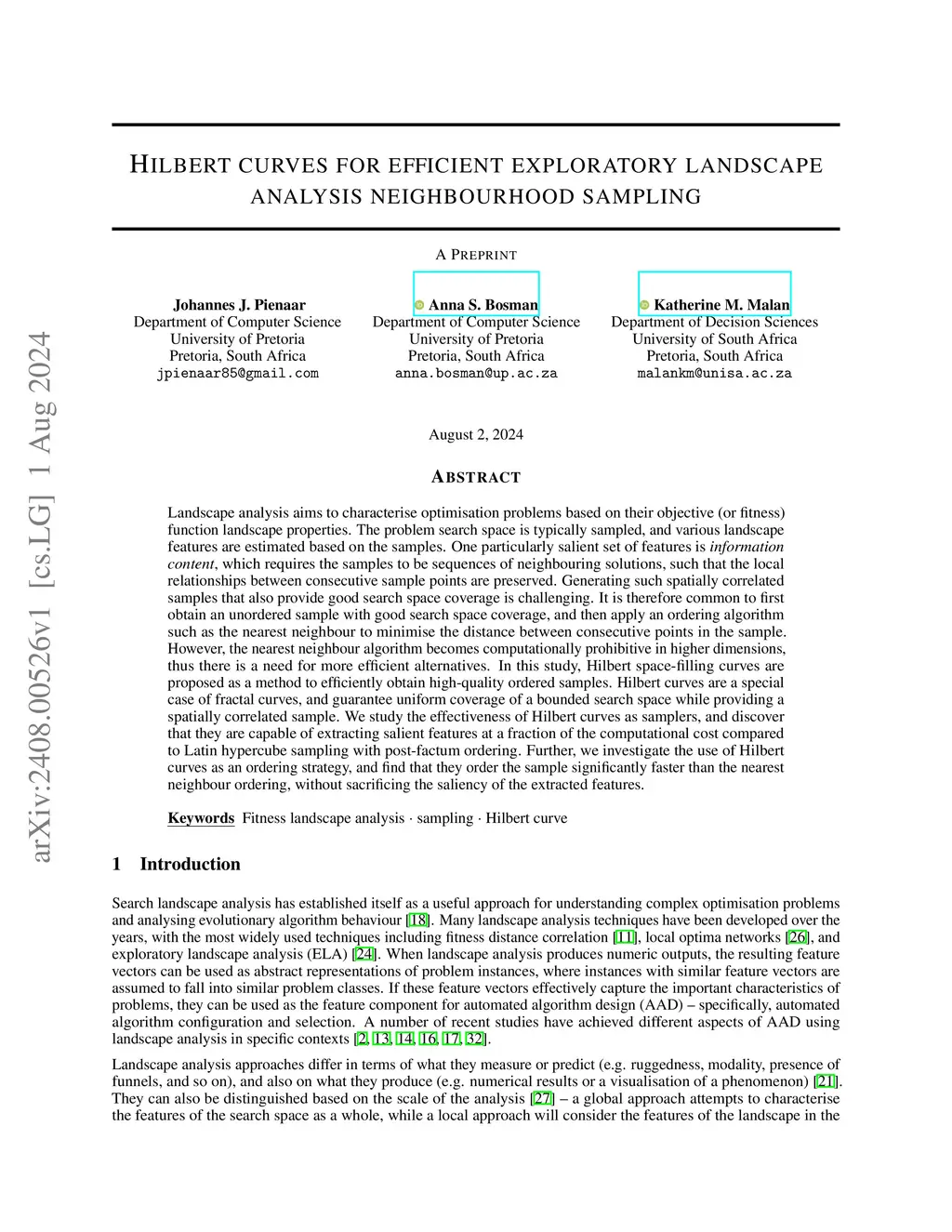 Landscape analysis aims to characterise optimisation problems based on their objective (or fitness) function landscape properties. The problem search space is typically sampled, and various landscape features are estimated based on the samples. One particularly salient set of features is information content, which requires the samples to be sequences of neighbouring solutions, such that the local relationships between consecutive sample points are preserved. Generating such spatially correlated samples that also provide good search space coverage is challenging. It is therefore common to first obtain an unordered sample with good search space coverage, and then apply an ordering algorithm such as the nearest neighbour to minimise the distance between consecutive points in the sample. However, the nearest neighbour algorithm becomes computationally prohibitive in higher dimensions, thus there is a need for more efficient alternatives. In this study, Hilbert space-filling curves are proposed as a method to efficiently obtain high-quality ordered samples. Hilbert curves are a special case of fractal curves, and guarantee uniform coverage of a bounded search space while providing a spatially correlated sample. We study the effectiveness of Hilbert curves as samplers, and discover that they are capable of extracting salient features at a fraction of the computational cost compared to Latin hypercube sampling with post-factum ordering. Further, we investigate the use of Hilbert curves as an ordering strategy, and find that they order the sample significantly faster than the nearest neighbour ordering, without sacrificing the saliency of the extracted features.