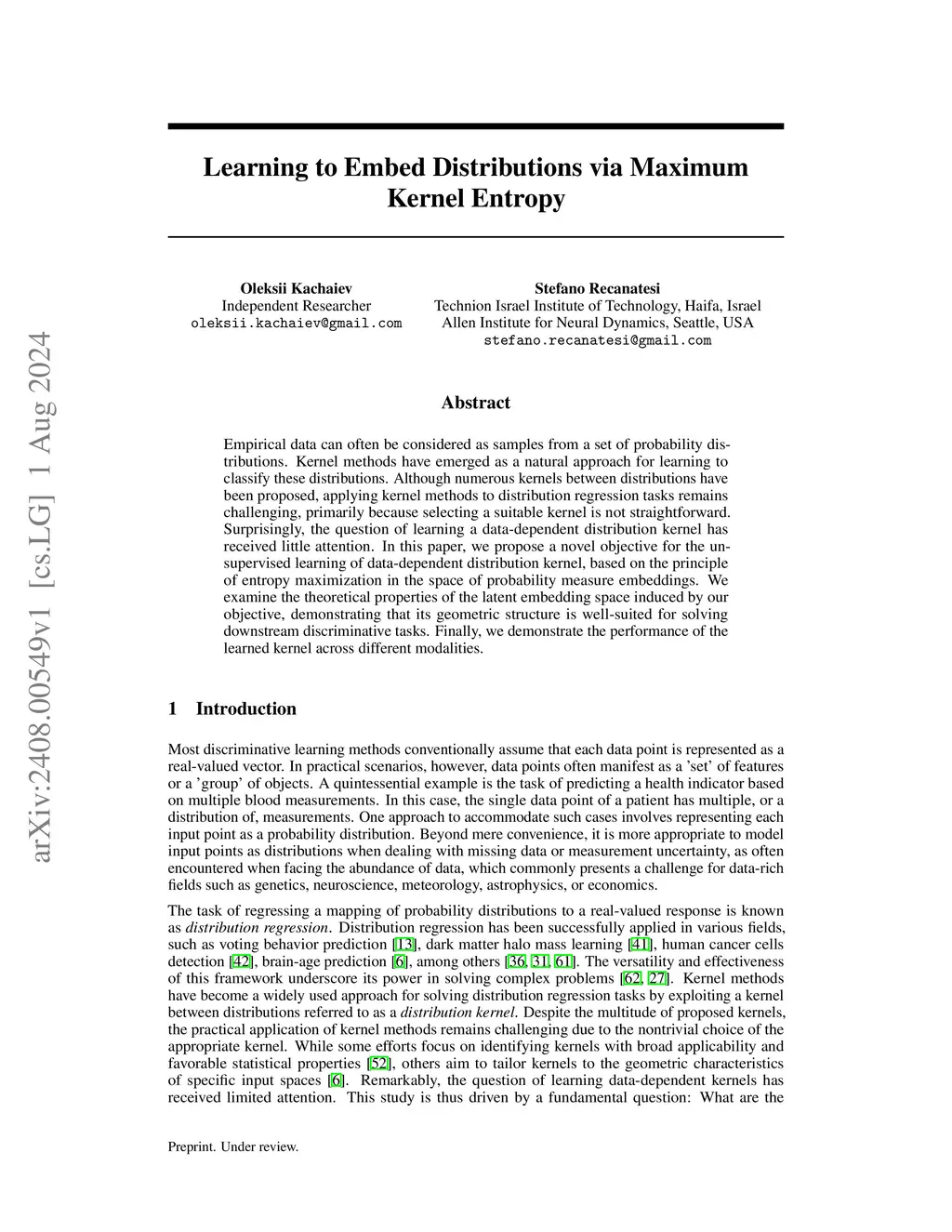 Empirical data can often be considered as samples from a set of probability distributions. Kernel methods have emerged as a natural approach for learning to classify these distributions. Although numerous kernels between distributions have been proposed, applying kernel methods to distribution regression tasks remains challenging, primarily because selecting a suitable kernel is not straightforward. Surprisingly, the question of learning a data-dependent distribution kernel has received little attention. In this paper, we propose a novel objective for the unsupervised learning of data-dependent distribution kernel, based on the principle of entropy maximization in the space of probability measure embeddings. We examine the theoretical properties of the latent embedding space induced by our objective, demonstrating that its geometric structure is well-suited for solving downstream discriminative tasks. Finally, we demonstrate the performance of the learned kernel across different modalities.