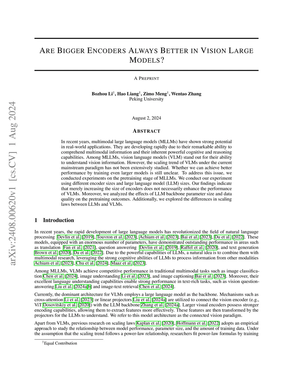In recent years, multimodal large language models (MLLMs) have shown strong potential in real-world applications. They are developing rapidly due to their remarkable ability to comprehend multimodal information and their inherent powerful cognitive and reasoning capabilities. Among MLLMs, vision language models (VLM) stand out for their ability to understand vision information. However, the scaling trend of VLMs under the current mainstream paradigm has not been extensively studied. Whether we can achieve better performance by training even larger models is still unclear. To address this issue, we conducted experiments on the pretraining stage of MLLMs. We conduct our experiment using different encoder sizes and large language model (LLM) sizes. Our findings indicate that merely increasing the size of encoders does not necessarily enhance the performance of VLMs. Moreover, we analyzed the effects of LLM backbone parameter size and data quality on the pretraining outcomes. Additionally, we explored the differences in scaling laws between LLMs and VLMs.