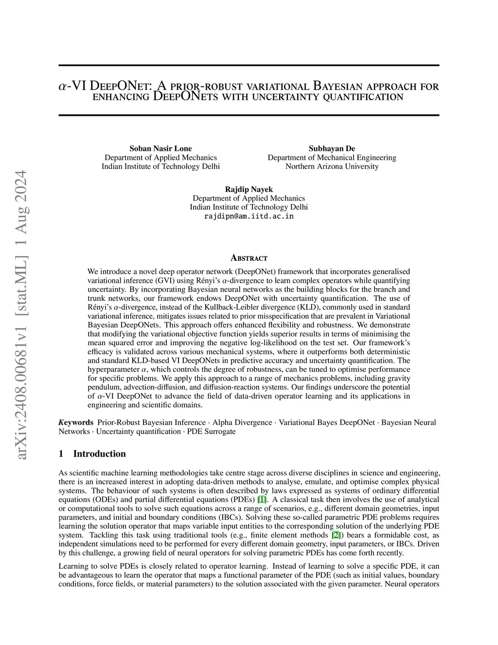 We introduce a novel deep operator network (DeepONet) framework that incorporates generalised variational inference (GVI) using Rényi's -divergence to learn complex operators while quantifying uncertainty. By incorporating Bayesian neural networks as the building blocks for the branch and trunk networks, our framework endows DeepONet with uncertainty quantification. The use of Rényi's -divergence, instead of the Kullback-Leibler divergence (KLD), commonly used in standard variational inference, mitigates issues related to prior misspecification that are prevalent in Variational Bayesian DeepONets. This approach offers enhanced flexibility and robustness. We demonstrate that modifying the variational objective function yields superior results in terms of minimising the mean squared error and improving the negative log-likelihood on the test set. Our framework's efficacy is validated across various mechanical systems, where it outperforms both deterministic and standard KLD-based VI DeepONets in predictive accuracy and uncertainty quantification. The hyperparameter , which controls the degree of robustness, can be tuned to optimise performance for specific problems. We apply this approach to a range of mechanics problems, including gravity pendulum, advection-diffusion, and diffusion-reaction systems. Our findings underscore the potential of -VI DeepONet to advance the field of data-driven operator learning and its applications in engineering and scientific domains.